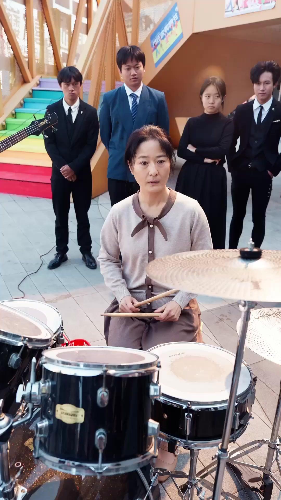 There’s something quietly revolutionary about a woman in a beige cardigan and brown bow collar, drumsticks in hand, standing before a Zildjian cymbal in the middle of a sun-drenched urban plaza—surrounded not by stage lights, but by rainbow stairs, shopping bags, and onlookers in business suits who clap like they’ve just witnessed a miracle. This isn’t a concert. It’s not even a flash mob. It’s *40, Ordinary, Conquering Showbiz*, and the opening scene alone rewrites the grammar of ambition. Jane Lawrence—the housewife, the mother, the woman whose name appears in golden script beside the Chinese characters for ‘family caretaker’—doesn’t ask permission to play. She simply lifts her arm, strikes the cymbal, and the world tilts. The camera lingers on her wrist as it moves: steady, practiced, unapologetic. Her foot presses the bass drum pedal with the same quiet certainty she uses to carry a red plastic basket full of leafy greens later in the film. That basket becomes a motif—a symbol of domestic labor that never quite disappears, even when she’s mid-solo, sweat glistening at her temples, eyes locked on the rhythm only she can hear.