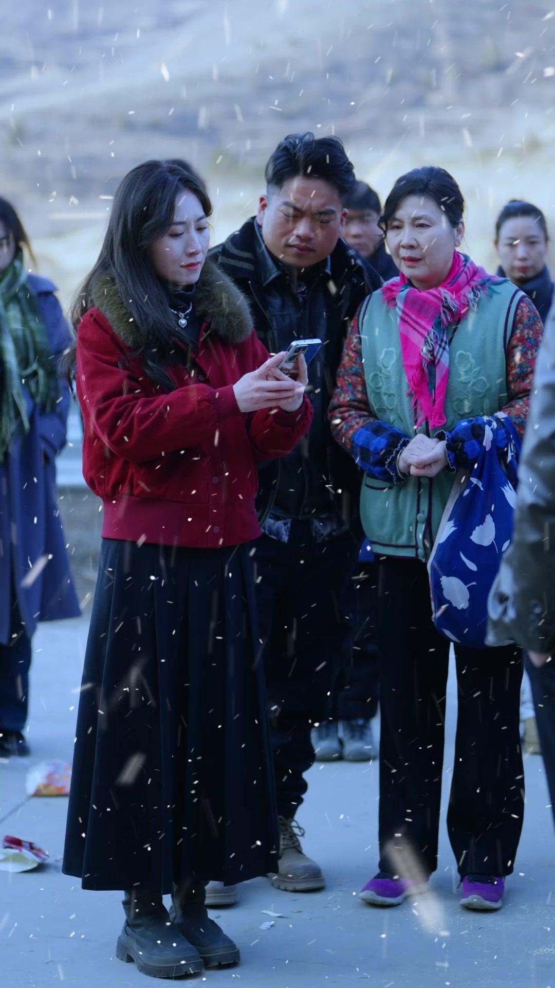 The crowd around her isn’t passive. They’re witnesses, yes, but also accomplices in silence. The older man in the black leather jacket—his silver-streaked hair combed back with military precision, his white turtleneck pristine beneath the harsh winter light—watches her with eyes that have seen too many endings. He doesn’t speak at first. He simply exhales, and the vapor hangs between them like unspoken judgment. When he finally lifts his own phone, it’s not to record or intervene, but to play something back—a voice memo, perhaps, or a recording of a prior confrontation. His lips move without sound in the early cuts, but later, when the wind dies for a breath, you catch the cadence: low, measured, almost paternal, yet edged with disappointment. He’s not her father, but he might as well be—the kind of uncle who shows up at funerals and board meetings alike, carrying both condolences and consequences. His presence anchors the scene in generational weight, reminding us that in small-town China, no crisis exists in isolation; every misstep echoes through family trees and village gossip networks.