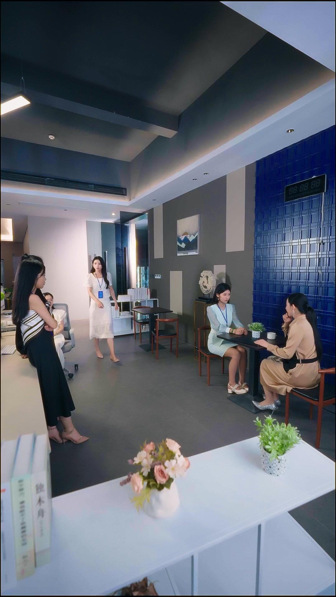Let’s unpack the staging. The setting isn’t just ‘modern office’—it’s *designed* to intimidate. Blue mosaic tiles echo institutional authority. The digital clock above the wall reads ‘00:00:00’, frozen, as if time itself is under review. The furniture is angular, functional, devoid of warmth—except for the small potted plants on the tables, which feel less like decoration and more like hostages: green life trapped in corporate sterility. Into this environment walks Lu Xingchen, in ivory lace, hair cascading like a deliberate contrast to the rigid lines around her. She doesn’t blend in. She *disrupts*. And the others notice. The woman in mint green—let’s call her Xiao Yu for now, though her name never appears on screen—shifts in her seat, her fingers tightening on the edge of the table. Not fear. Anticipation. She’s seen this before. Or she thinks she has.