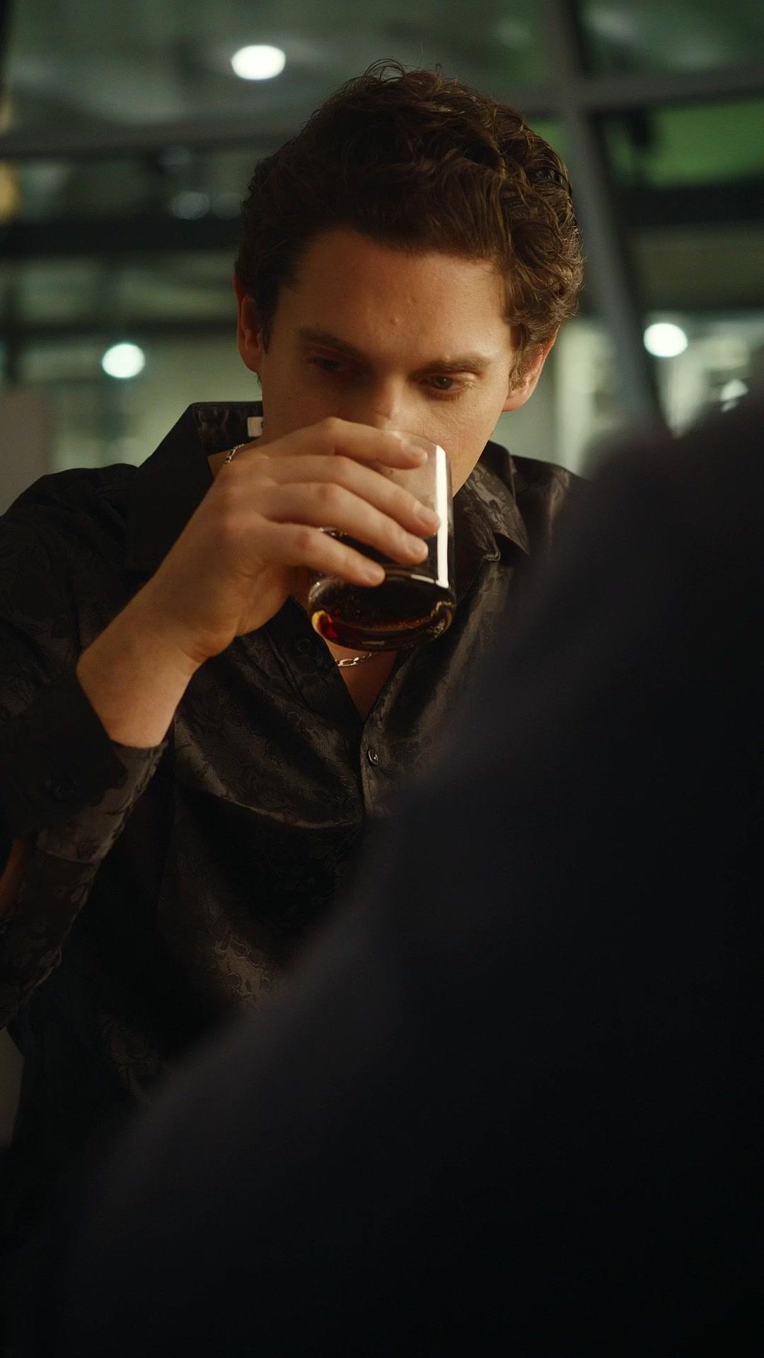 There’s a quiet kind of devastation that doesn’t scream—it simmers. In this tightly framed, dimly lit exchange between Andrew and Tom, we’re not watching a confrontation so much as the slow collapse of a carefully constructed illusion. Andrew, dressed in that dark brocade shirt—luxurious but slightly rumpled, like a man who’s been holding himself together for too long—sips whiskey with the precision of someone trying to steady his nerves. His eyes, though, betray him: sharp, restless, flickering between defensiveness and disbelief. He’s not just drinking; he’s bracing. Every movement is deliberate, from the way he grips the glass to how he leans forward when challenged, as if trying to physically pull the truth out of Tom’s mouth before it slips away.