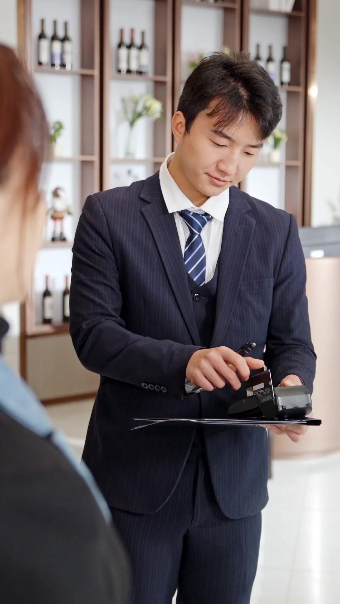 In a sleek, modern lobby adorned with minimalist wine shelves and soft ambient lighting, a quiet transaction becomes the catalyst for emotional detonation. At first glance, it’s just another upscale reception—polished floors, discreet staff in navy uniforms, and guests dressed like they’ve stepped out of a luxury catalog. But beneath the surface, tension simmers like espresso left too long on the burner. The young man in the pinstripe suit—let’s call him Li Wei—isn’t merely processing a payment; he’s holding a mirror to the group’s fragile hierarchy. His posture is deferential, his smile practiced, yet his eyes flicker with something sharper: awareness. He knows what’s coming. When he presents the POS terminal, it’s not a tool—it’s a trigger.