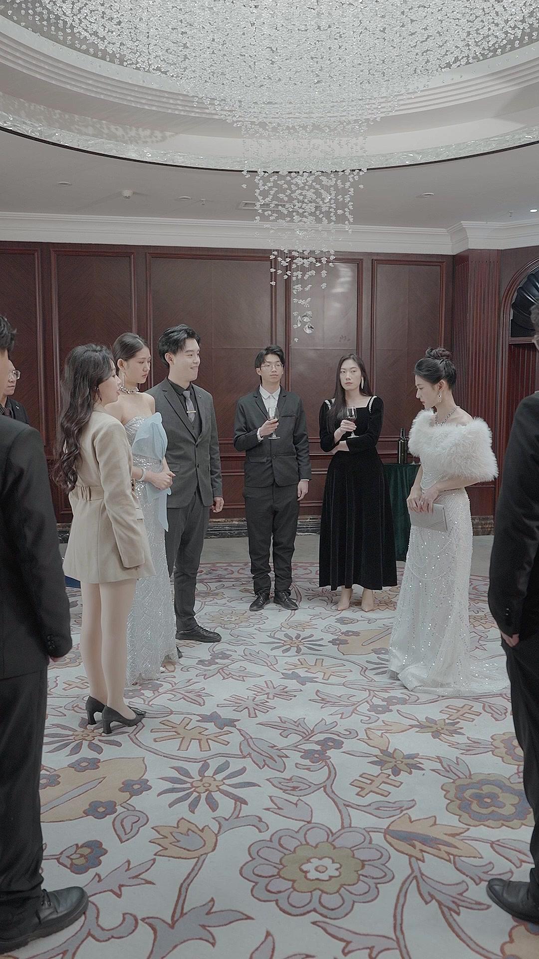 The ensemble around her isn’t random. It’s curated drama. To her left, Su Wei—sharp-shouldered in a beige power suit, belt cinched like a weapon—leans forward just enough to signal intent. Her eyes dart between Lin Xiao and the woman in pale blue silk, Chen Rui, whose gown blooms like a frost-kissed peony across her torso. Chen Rui’s expression is unreadable, but her fingers tremble slightly against the fabric of her dress, betraying the storm beneath the calm surface. Behind them, two men stand like sentinels: Zhang Hao, in charcoal gray with a tie clip shaped like a dagger, smirking faintly—not at the conflict, but at how *predictable* it all feels to him. And then there’s Li Jun, the one in the burgundy tie, who keeps glancing toward the door, as though escape is still an option. He’s wrong. There is no exit here. Only escalation.