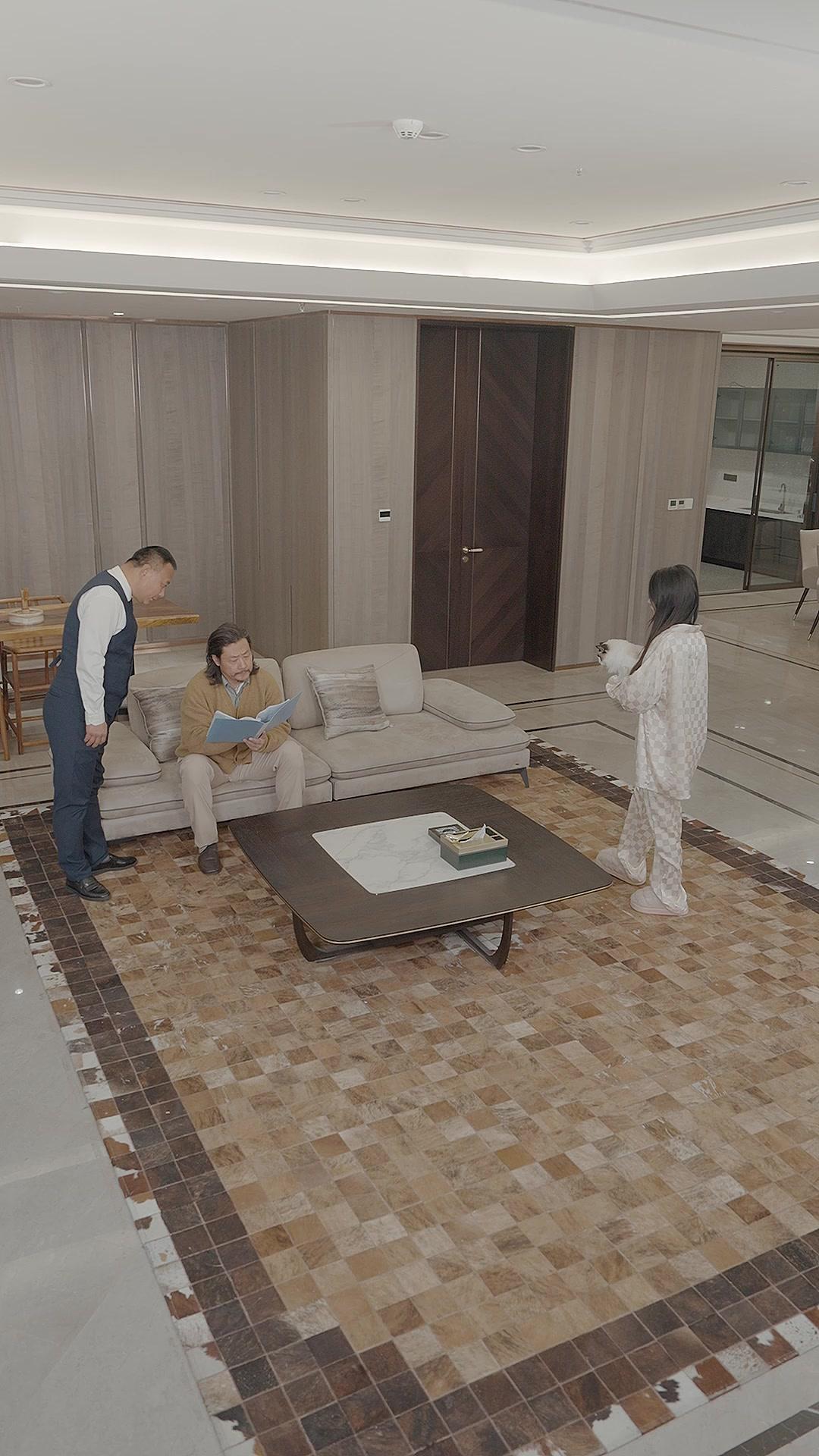 There’s a particular kind of tension that only exists in rooms where no one is shouting—where the loudest sound is the rustle of paper, the click of a heel on marble, or the soft thump of a cat’s paw against silk. Don't Mess With the Newbie opens not with fanfare, but with stillness: a high-ceilinged lounge, walls lined in brushed wood, light diffused through sheer curtains like breath held too long. At its center, three figures orbit each other like planets caught in a delicate gravitational dance. Li Wei, seated, exudes the weary dignity of a man who’s signed too many papers and forgotten why. Zhang Tao stands beside him, posture precise, tie perfectly knotted—a human footnote in someone else’s story. And then there’s Xiao Yu: barefoot, in cream-and-ivory checkered pajamas that shimmer faintly under the recessed lighting, holding a Ragdoll cat named Mochi like it’s the only thing anchoring her to reality. She doesn’t enter the scene. She *occupies* it. And that’s where the film’s genius begins—not in what’s said, but in what’s withheld.
