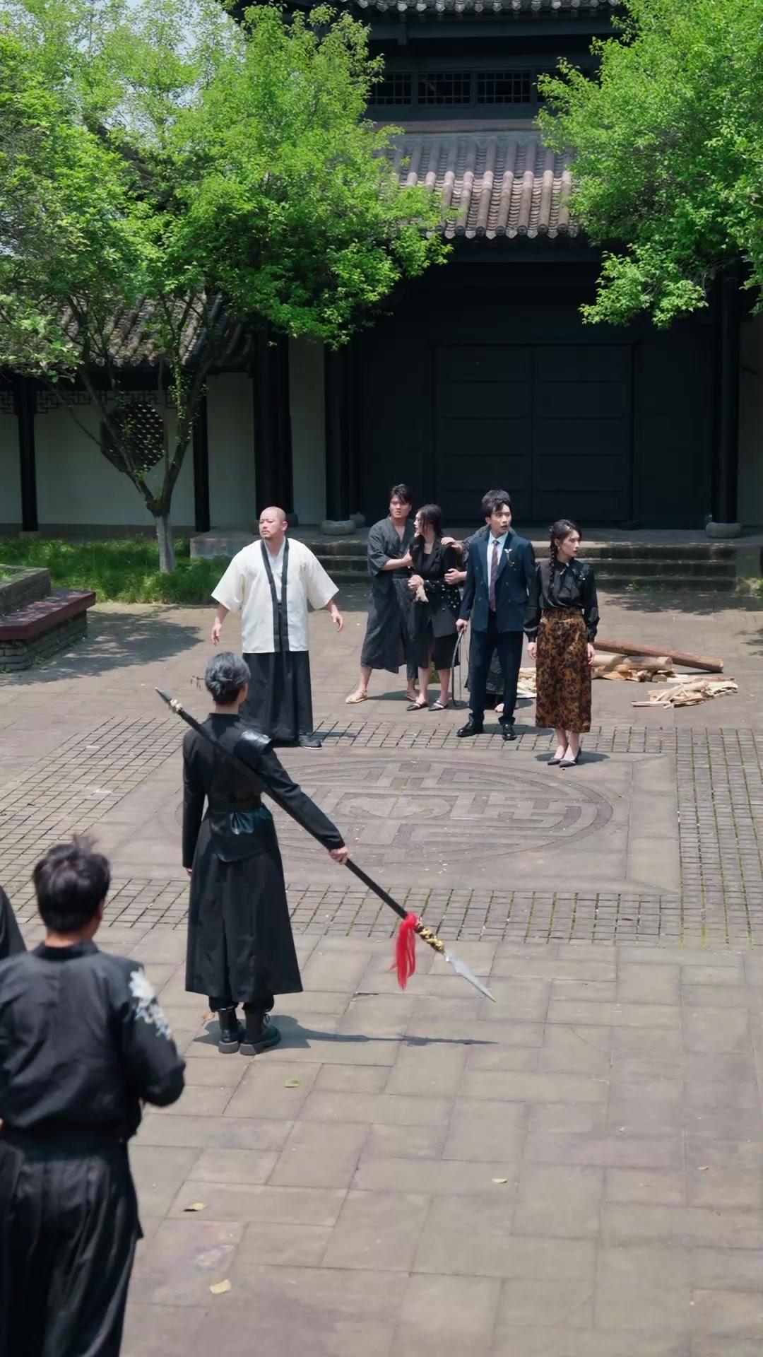 And then there’s Chen Wei, the young man in the navy double-breasted suit, striped tie pinned with a golden eagle brooch—a symbol of ambition, of Western education grafted onto Eastern tradition. He points. Not with a weapon. Not with a scroll. Just a finger, trembling slightly, aimed directly at Lin Xiao. His mouth moves, but we don’t hear his words—only the tightening of his jaw, the pulse visible at his temple, the way his knuckles whiten around the leather-wrapped hilt of a short staff he carries like a gentleman’s cane. He’s not shouting. He’s *accusing*. And in that accusation lies the entire moral fracture of the series: Is Lin Xiao enforcing justice—or executing vengeance? Is Chen Wei defending morality—or protecting privilege? His stance is rigid, his posture upright, but his eyes flicker—once toward Yun Mei, once toward Kaito, once toward the archers now lining the perimeter, bows drawn, arrows nocked, their faces impassive masks of duty. These archers aren’t background extras. They’re the silent chorus of the old world, waiting for the signal to turn this courtyard into a tomb.