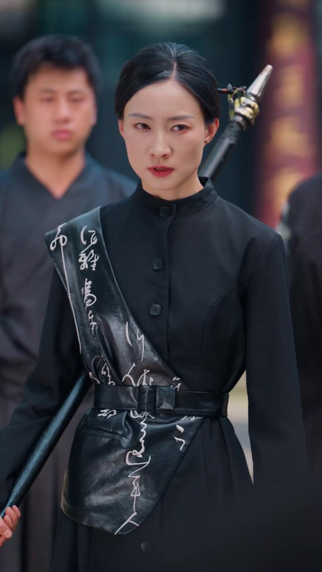 At the center stands Lin Mei, her black high-collared robe immaculate except for the diagonal sash of lacquered leather, inscribed with flowing white calligraphy that seems to pulse like veins under the light. Her hair is pulled back with surgical precision, secured by a slender jade-and-bronze hairpin shaped like a fallen leaf—delicate, yet unmistakably lethal. She grips the spear not as a weapon, but as an extension of her spine: the shaft dark, the tip gleaming with gold filigree and a single red tassel that trembles with each breath she takes. Her eyes do not flicker. They fix on the man in the cream-colored haori—the one they call Master Kaito—with the stillness of a predator who has already decided the outcome. There is no rage in her gaze, only a chilling clarity, as if she’s watching a play she’s read a hundred times before, waiting for the actor to finally deliver the line that seals his fate.