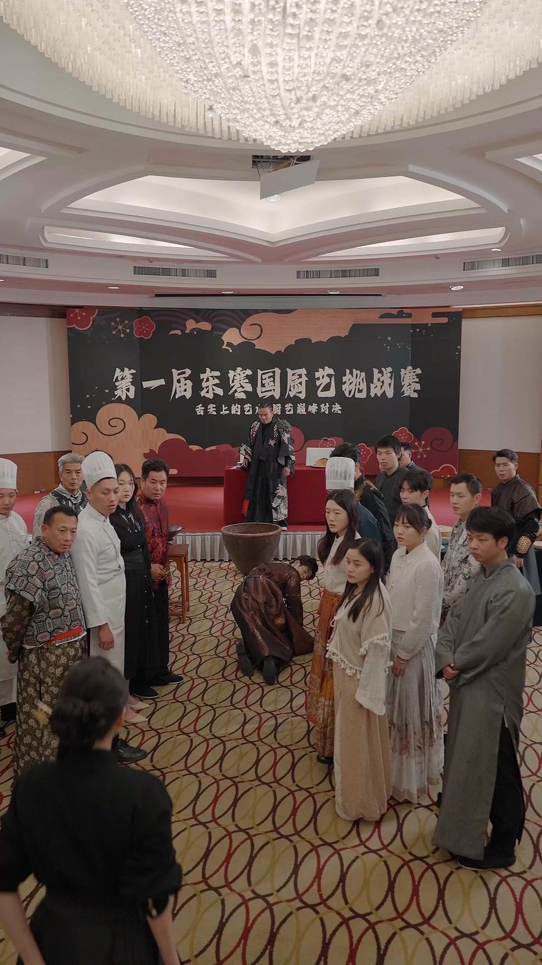 The moment the first fish hit the water in that oversized ceramic tub, the air changed. Not with sound, but with *tension*—the kind that settles in your molars and hums in your ribs. This wasn’t a cooking competition. It was a trial by fire, ice, and silence, staged in a ballroom where chandeliers hung like fallen stars and the banner behind the stage declared, in bold calligraphy, the ‘First Donghan National Culinary Art Challenge.’ But the real challenge wasn’t listed on the banner. It was written in the set of Chen Wei’s jaw, the twitch in Feng Zhi’s eye, and the calm, unblinking stare of Yue Lan—the woman who would, by the end of ninety minutes, redefine what it means to hold a knife.