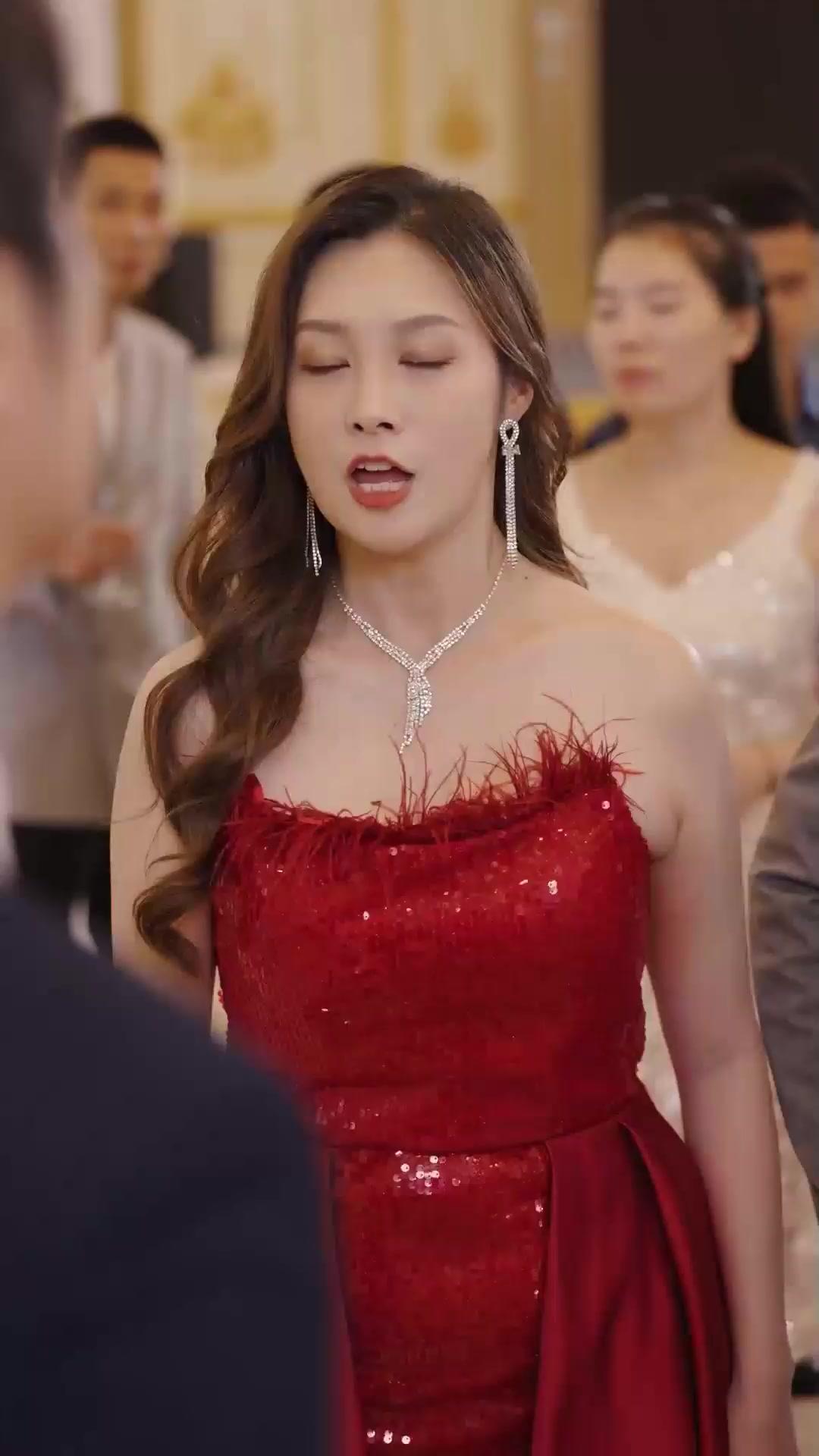 Chen Wei’s reaction is masterclass-level restraint. He doesn’t flinch. He doesn’t deny. He simply *listens*, his eyes narrowing just enough to signal he’s processing, not panicking. His suit—navy, pinstriped, double-breasted—suits him like a second skin, but the way his shoulders tense, the slight hitch in his breath when Lin Xiao’s voice rises (we see her throat pulse, her jaw working), tells us he’s bracing for impact. What’s fascinating is how the film uses costume as psychological mapping. Lin Xiao’s red dress isn’t just bold—it’s *vulnerable*. The feather trim at the bustline quivers with every heartbeat, the sequins catching light like shattered glass. Meanwhile, Yao Mei, in her white gown with those cascading crystal straps, stands apart—not aloof, but *observant*. Her hands remain clasped low, near her waist, a posture of neutrality that feels increasingly like complicity. When she finally speaks, her lips form soft consonants, her head tilting slightly, as if offering a lifeline—but to whom? Chen Wei? Lin Xiao? Or herself?