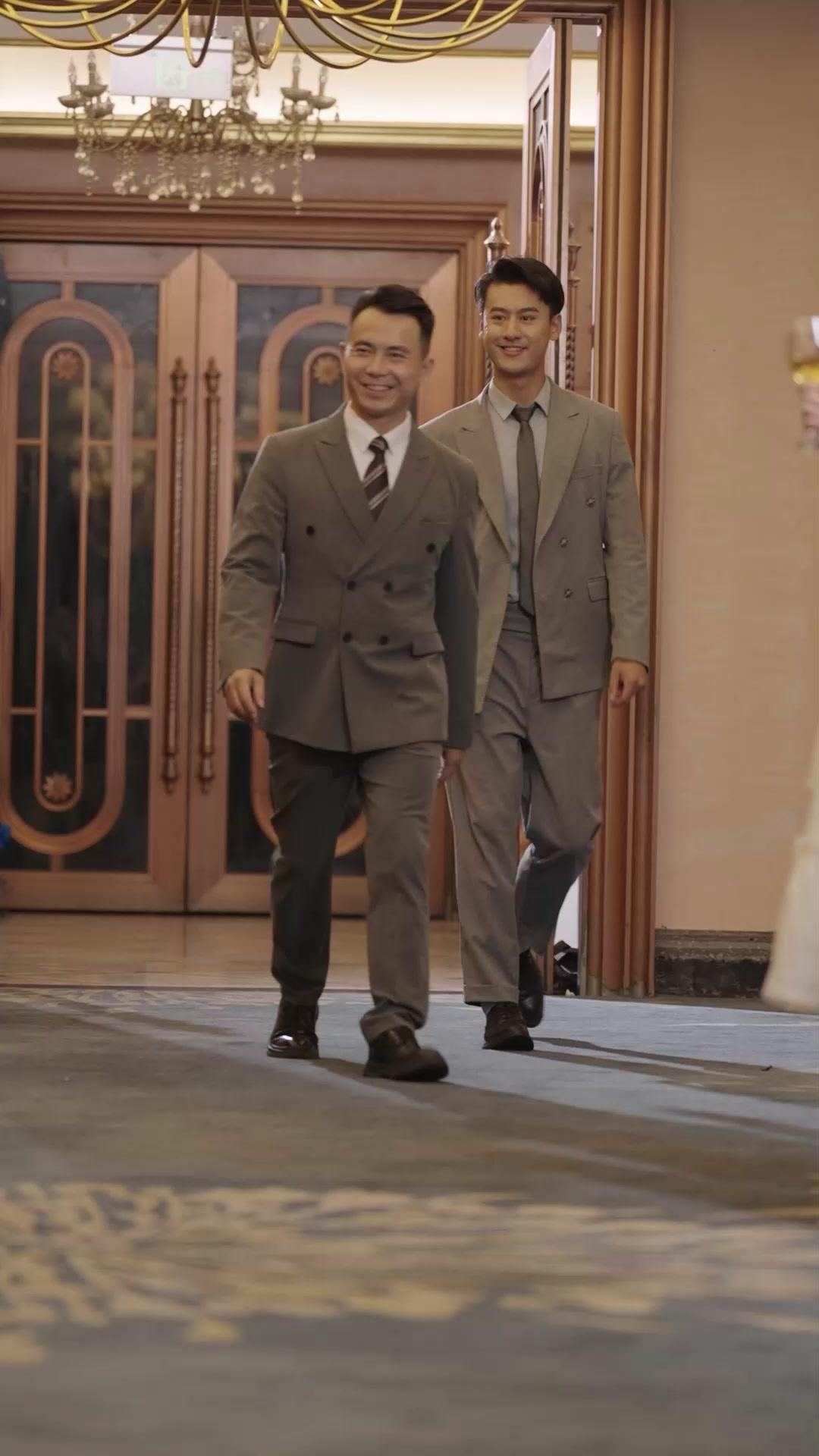 Let’s rewind to the beginning. The corridor is warm, rich, suffused with the soft hum of background chatter and clinking glassware. Lin Wei and Zhang Hao enter like co-stars in a silent film—no dialogue needed, just synchronized movement and facial nuance. Lin Wei leads, but Zhang Hao never trails far. Their suits are nearly identical in cut, yet the shade difference matters: Lin Wei’s is darker, heavier, like aged oak; Zhang Hao’s is lighter, airier, like brushed steel. Symbolism? Perhaps. Or perhaps it’s just tailoring. But in *Guarding the Dragon Vein*, nothing is accidental. When a woman in a cream dress raises her wineglass toward them—only partially visible, her face obscured—their reactions diverge. Lin Wei grins, waves, leans in as if to share a secret. Zhang Hao nods politely, eyes steady, offering no warmth, only acknowledgment. He’s not rejecting her; he’s *filtering* her. That’s the first clue: Lin Wei performs charisma; Zhang Hao curates influence.