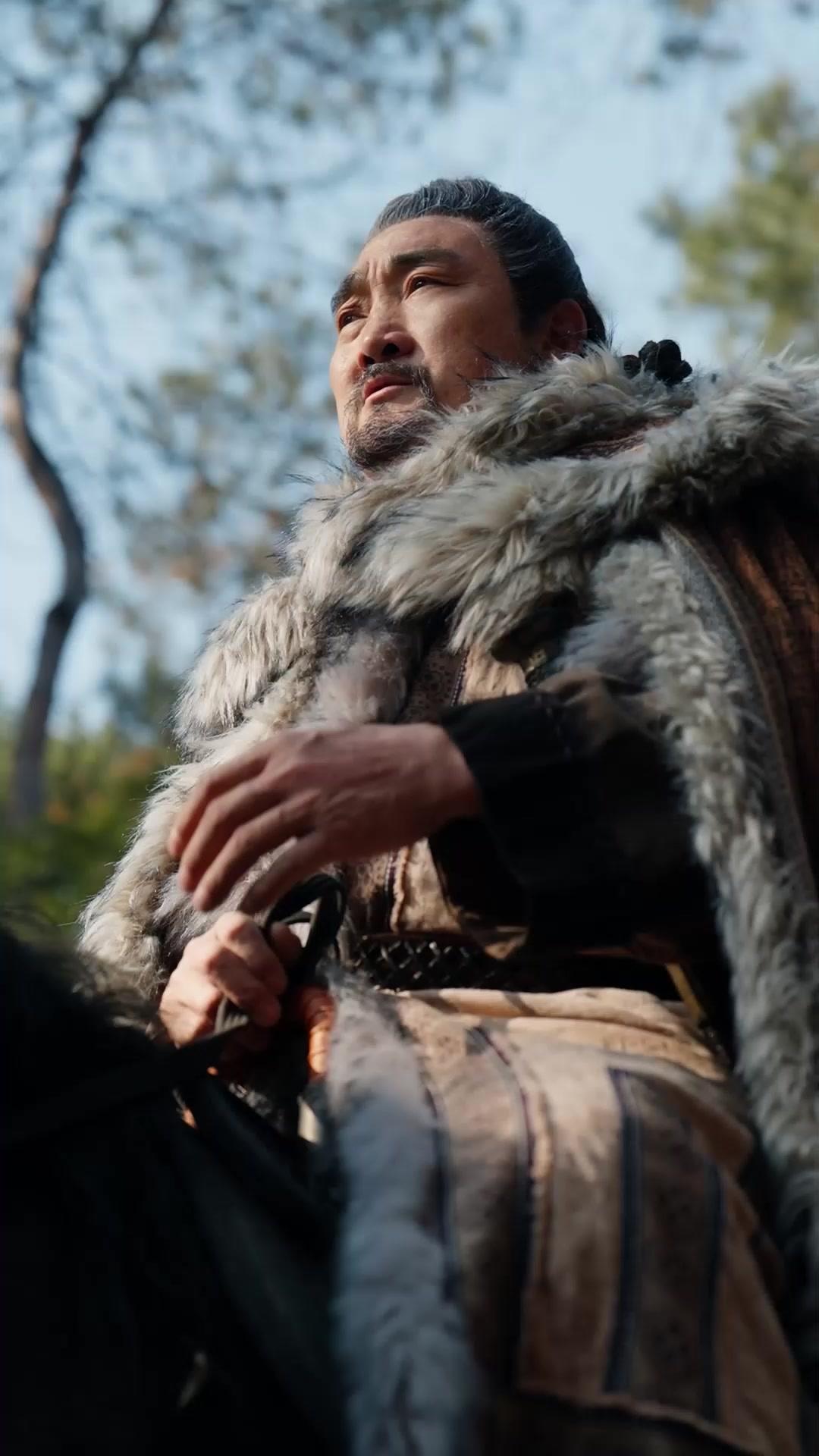 Khan Batur’s hands rest loosely on the reins, yet his fingers twitch—not with nervousness, but with memory. His gaze drifts upward, not toward the sky, but toward the canopy where shadows shift like restless spirits. His expression is unreadable, but his eyes betray him: they hold the weight of decades, of battles won and sons lost, of treaties signed in blood and broken before ink dried. When he speaks—softly, almost to himself—he says only, ‘The wind carries old voices today.’ It’s not a statement. It’s an invitation. A test. And Jargal, for all his ornate chestplate and braided hair crowned with a turquoise-studded knot, hesitates. His jaw tightens. His grip on the sword hilt at his hip shifts, just once, from relaxed to ready. He doesn’t answer immediately. He watches Khan’s profile—the way the fur collar frames his graying temples, the slight tremor in his left hand when he lifts it to adjust his sleeve. Jargal sees it. We see it. And that’s what makes this scene ache with dread.