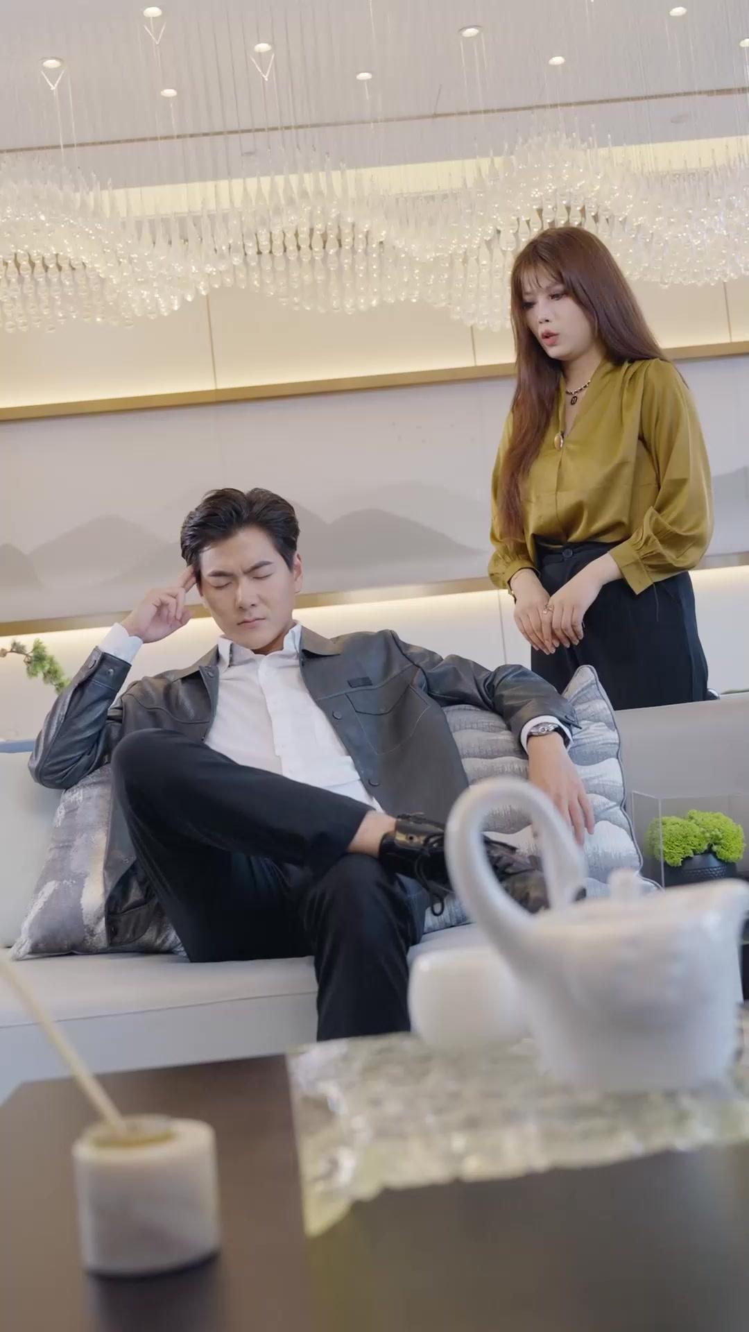 In the opening sequence of *Just Divorce, We'd Love to Marry You*, we’re dropped into a world where luxury isn’t just aesthetic—it’s psychological warfare. The setting is a high-end lounge, all soft curves, ambient lighting, and that signature chandelier dripping like frozen rain—elegant, yes, but also cold, distant, almost clinical. Seated on the sofa is Lin Zeyu, dressed in a charcoal leather jacket over a crisp white shirt, his posture relaxed yet rigid, one leg crossed over the other, fingers tapping lightly against his temple as if he’s solving an equation only he can see. His expression shifts subtly across frames: eyes closed, lips parted, then a slow blink—like he’s rehearsing a line he never intends to speak aloud. Standing beside him is Shen Moxi, her mustard silk blouse catching the light like liquid gold, black trousers sharp at the waist, hands clasped low in front of her, knuckles pale. She doesn’t fidget. She doesn’t breathe too loudly. She waits. And in this silence, the tension builds—not with music or cuts, but with the weight of what hasn’t been said.