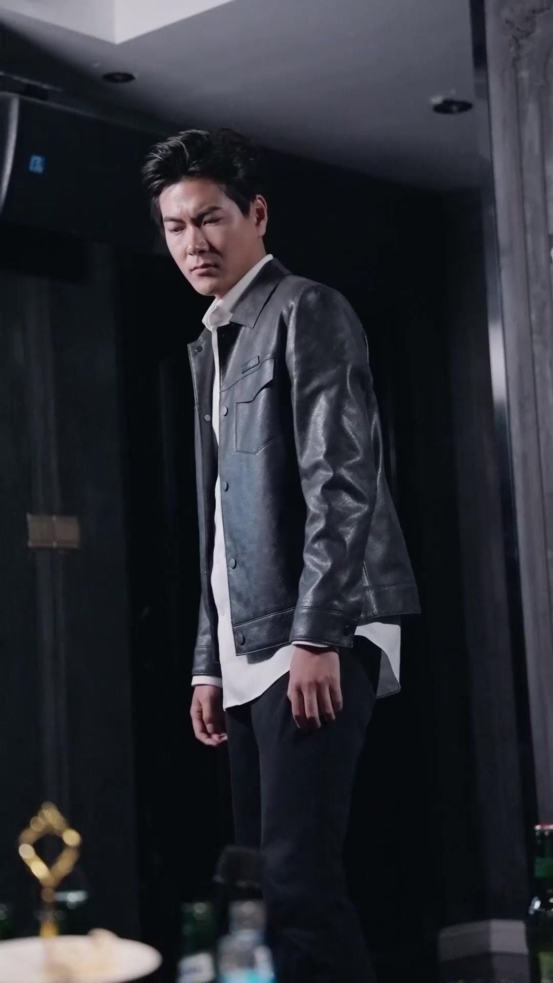 In the dimly lit corridor of what appears to be an upscale urban apartment building—or perhaps a private lounge with minimalist industrial aesthetics—the air hums with unspoken history. A man in a textured black leather jacket over a crisp white shirt steps forward, his posture relaxed yet deliberate, as if he’s rehearsed this entrance a hundred times but still can’t quite suppress the flicker of hesitation in his eyes. His name, according to the show’s subtle branding and fan consensus, is Lin Zeyu—a character whose quiet intensity has become synonymous with emotional restraint in modern short-form drama. He doesn’t rush. He doesn’t linger. He simply *exists* in the space between decision and consequence. Behind him, bottles of soju and half-empty glasses suggest a party just ended—or one that never truly began. The golden trophy on the table isn’t for winning; it’s for surviving another round of polite lies.