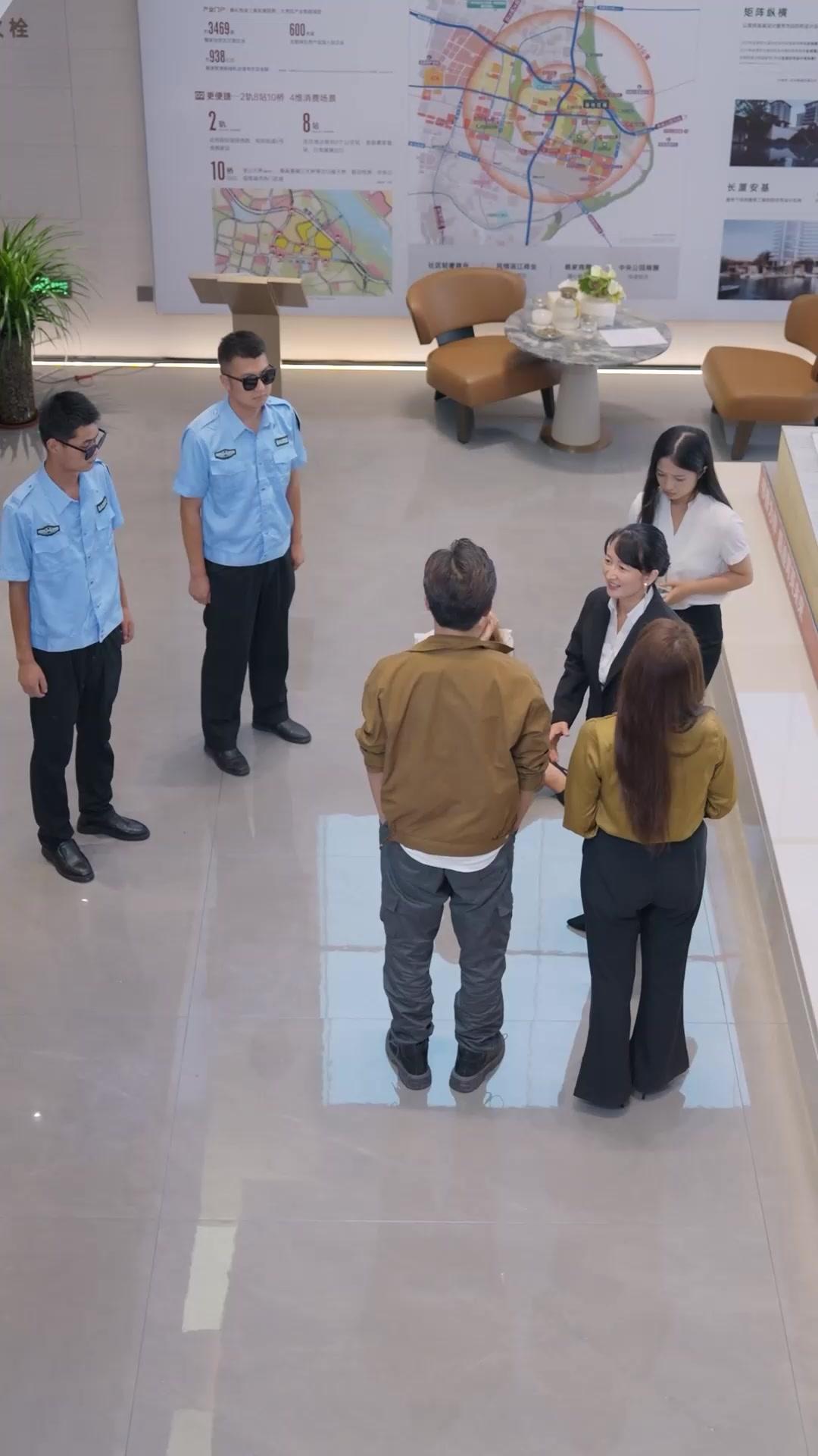 In the sleek, polished lobby of what appears to be a high-end real estate showroom—walls adorned with glossy maps, floor-to-ceiling infographics, and minimalist furniture—the air hums with curated professionalism. Yet beneath that veneer, something volatile simmers. The scene opens with six individuals arranged in a loose semicircle: two security guards in crisp light-blue uniforms stand rigidly at attention, their postures betraying neither curiosity nor concern; a man in a tan utility jacket—let’s call him Li Wei—faces three women, each radiating different shades of corporate polish. One, in a black blazer and white blouse, exudes seasoned authority—this is Manager Lin, her gold hoop earrings catching the ambient light like subtle warnings. Beside her stands a younger woman in mustard-yellow silk, hands clasped low, eyes wide with quiet alarm—this is Xiao Mei, the junior associate whose silence speaks volumes. And then there’s the third: Chen Yan, in a ruffled white blouse with a black ribbon tie, black mini-skirt, and patent heels—her outfit screams ‘polished ambition,’ but her posture already hints at fragility.