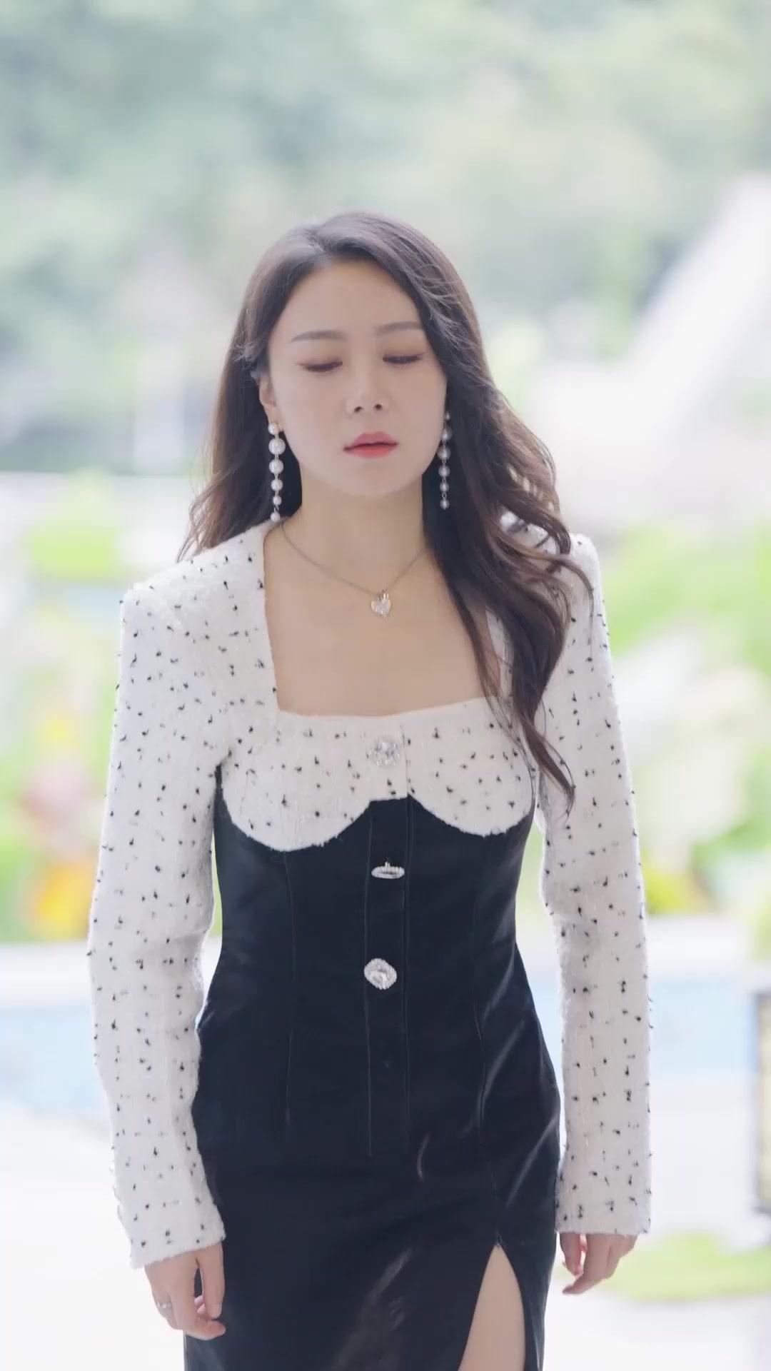 The first shot of Lin Xiao walking toward the camera is deceptively serene. Sunlight filters through sheer curtains, casting soft halos around her silhouette. Her dress—a structured black velvet base with a white tweed overlay dotted with black flecks—suggests duality: tradition and rebellion, softness and steel. Her long hair flows freely, unbound, unlike Jiang Mei’s tightly coiled updo later in the scene. Even her jewelry tells a story: dangling pearl earrings that sway with intention, a heart-shaped pendant that glints faintly—not ostentatious, but undeniable. She doesn’t rush. She doesn’t hesitate. She simply *arrives*, and in doing so, disrupts the equilibrium of the entire room. This isn’t an entrance; it’s an indictment.