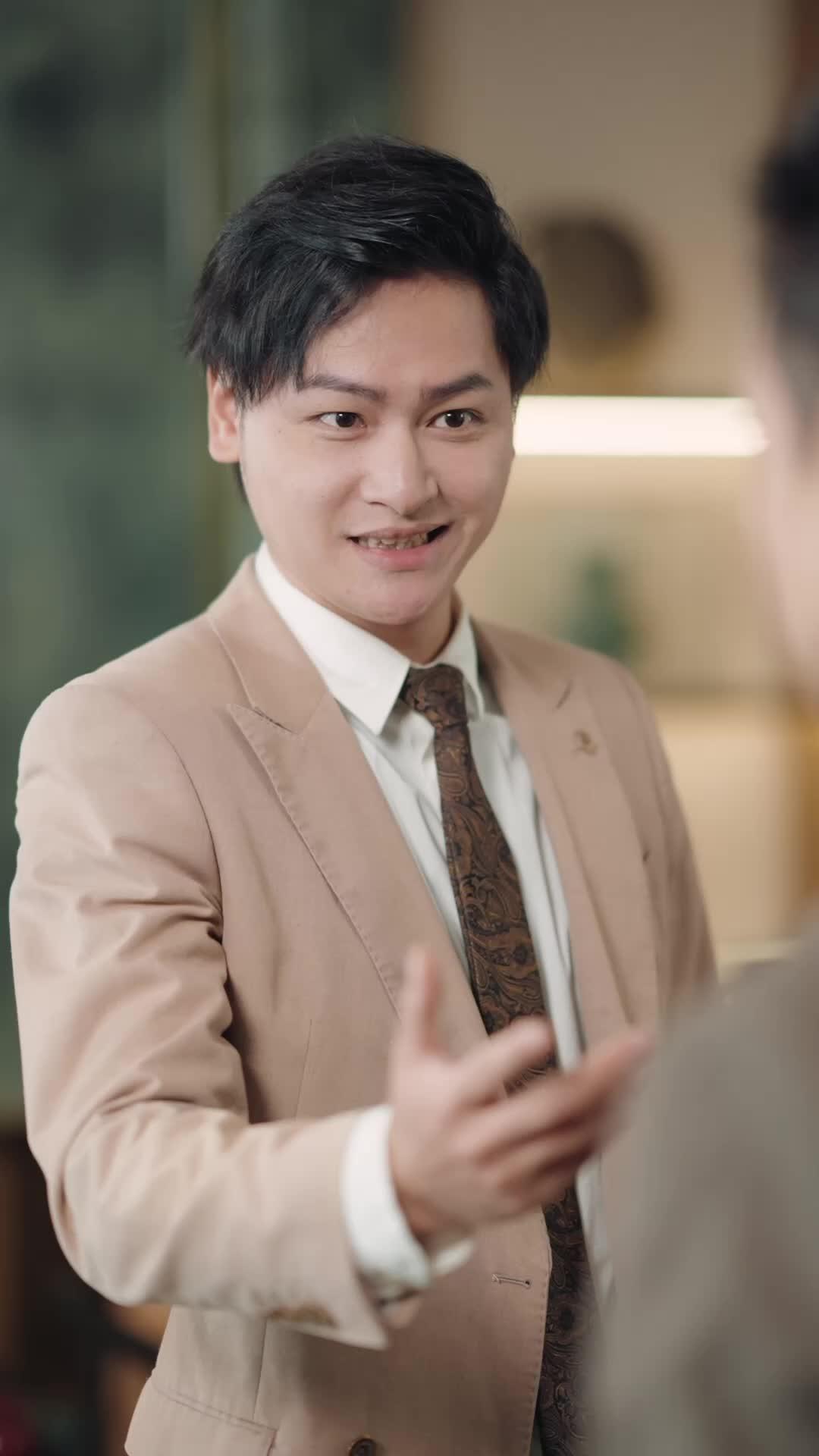 In the meticulously staged tension of Karma Pawnshop, every gesture is a loaded bullet, and every silence carries the weight of unspoken betrayal. The opening frames introduce us not with exposition, but with a man—Li Wei—in a beige double-breasted suit, his smile too wide, his hand too animated, as if trying to convince himself he’s in control. His tie, ornate and swirling like a trapped serpent, hints at a personality that masks volatility beneath polished decorum. He speaks, but we don’t hear the words—only the cadence, the slight tremor in his wrist as he gestures toward someone off-screen. That’s the genius of this sequence: sound is implied, not delivered. We read the room through micro-expressions, posture shifts, and the subtle recalibration of spatial hierarchy.