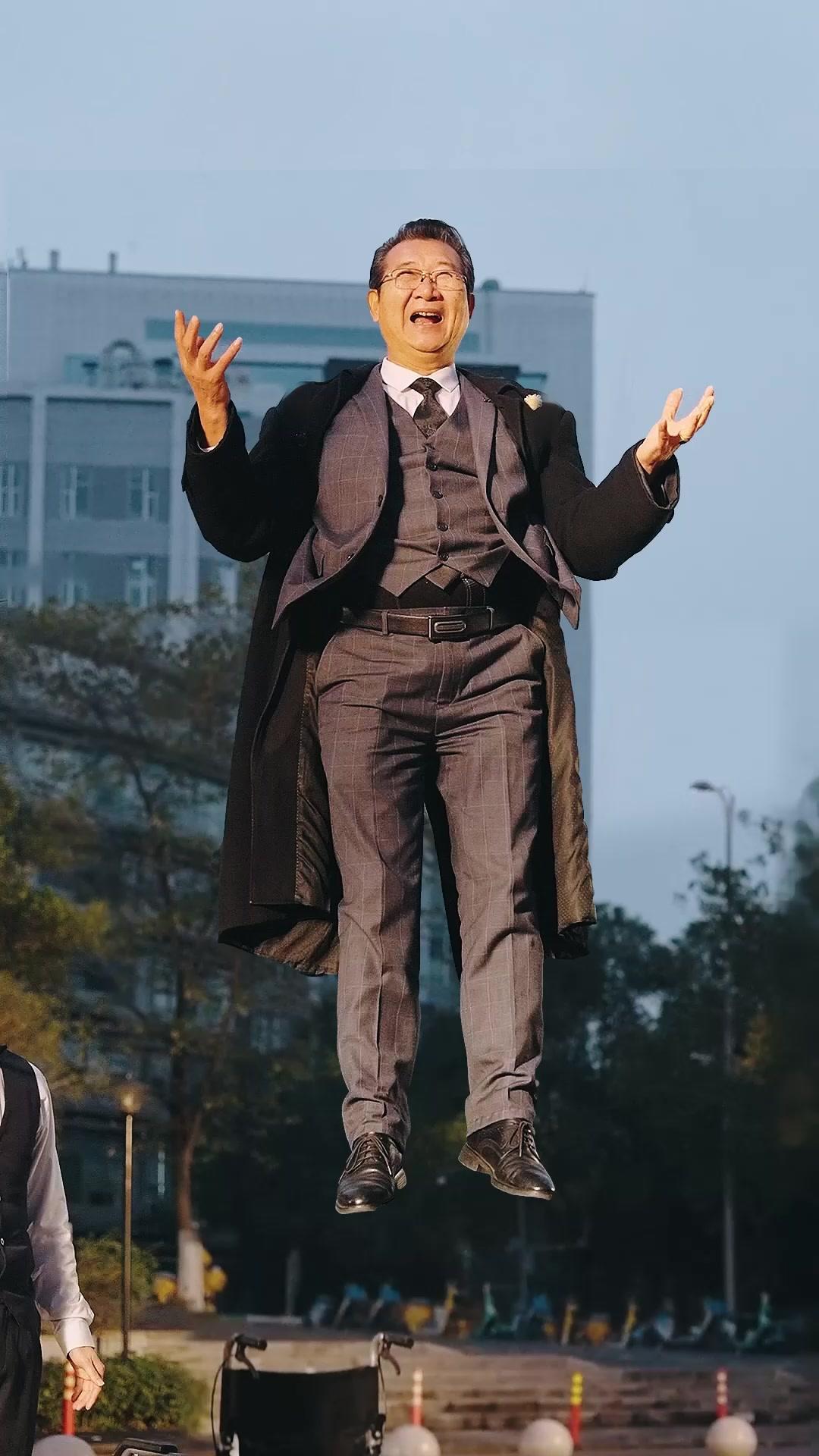 In a quiet urban plaza, flanked by leafy trees and modern high-rises, an extraordinary spectacle unfolds—not with pyrotechnics or CGI, but with raw human expression, layered tension, and a touch of surreal whimsy. At the center stands Mr. Lin, a dignified elder in a charcoal-gray three-piece suit beneath a long black overcoat, his glasses perched low on his nose, a golden brooch pinned to his lapel like a silent badge of authority. He floats—yes, *floats*—mid-air, arms outstretched, mouth agape in what could be interpreted as ecstasy, shock, or invocation. His feet hover inches above a crumpled envelope lying on the pavement, as if gravity itself has paused to listen. Behind him, a wheelchair sits abandoned, its presence whispering of physical limitation now defied—or perhaps, symbolically transcended. This is not magic realism for effect alone; it’s a visual metaphor steeped in cultural resonance: the elder, once bound by age or expectation, momentarily unshackled, suspended between earth and sky, between duty and desire.