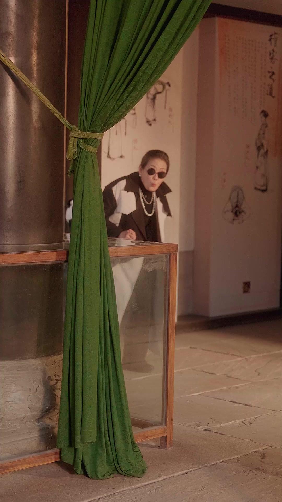 Then, from behind a heavy green curtain tied with a hemp rope, two figures slip into frame like shadows given form. An older woman—Madam Chen, we’ll name her—wears a coat that defies era: black-and-cream geometric panels, sharp as a blade’s edge, layered over a high-necked black turtleneck. Around her neck, three strands of pearls rest like a necklace of restrained sorrow. Her sunglasses are round, dark, and impenetrable—not fashion, but armor. Beside her, clutching her hand with the desperate grip of a child who fears being left behind, is a boy no older than seven. He wears a panda hat—plush, oversized, with embroidered eyes and fuzzy ears that bob with each step. His outfit is gray, loose-fitting, traditional in cut but modern in spirit, cinched at the waist with a black sash. A string of dark wooden prayer beads hangs around his neck, and he carries a small cloth sack slung across his chest, its drawstring tied in a knot only he knows how to undo.