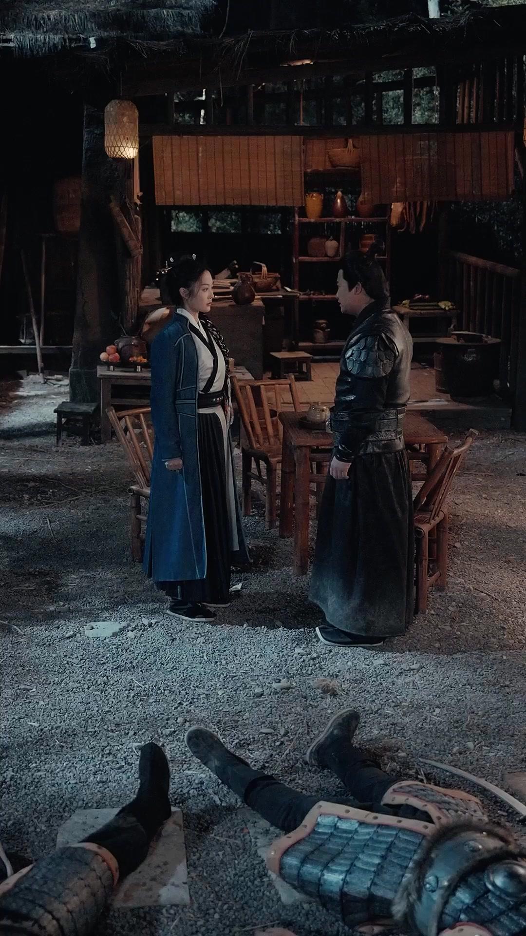 In the dim glow of a thatched-roof tavern, where lantern light flickers like a dying pulse and the scent of aged wood and spilled wine lingers in the air, two figures stand frozen—not by fear, but by the unbearable weight of unspoken truths. This is not just a scene; it’s a psychological chamber piece disguised as historical drama, and *Legacy of the Warborn* delivers it with surgical precision. The woman—let’s call her Jing—wears a deep indigo robe layered over a white inner tunic, its black sash cinched tight like a vow she’s sworn to keep. Her hair, braided with threads of crimson and silver, falls over one shoulder like a banner of defiance, yet her posture remains rigid, almost brittle. She doesn’t flinch when the man opposite her—General Lin, clad in lacquered black armor that gleams like obsidian under the low light—shifts his weight, his knuckles whitening at his sides. His expression is a storm contained: brows drawn, jaw clenched, eyes darting between her face, the floor, and the two armored corpses sprawled at their feet like discarded props. One lies half-turned, his helmet askew, blood pooling darkly beneath his neck. The other’s hand still grips the hilt of a sword buried in the gravel—a final act of loyalty, or perhaps desperation.