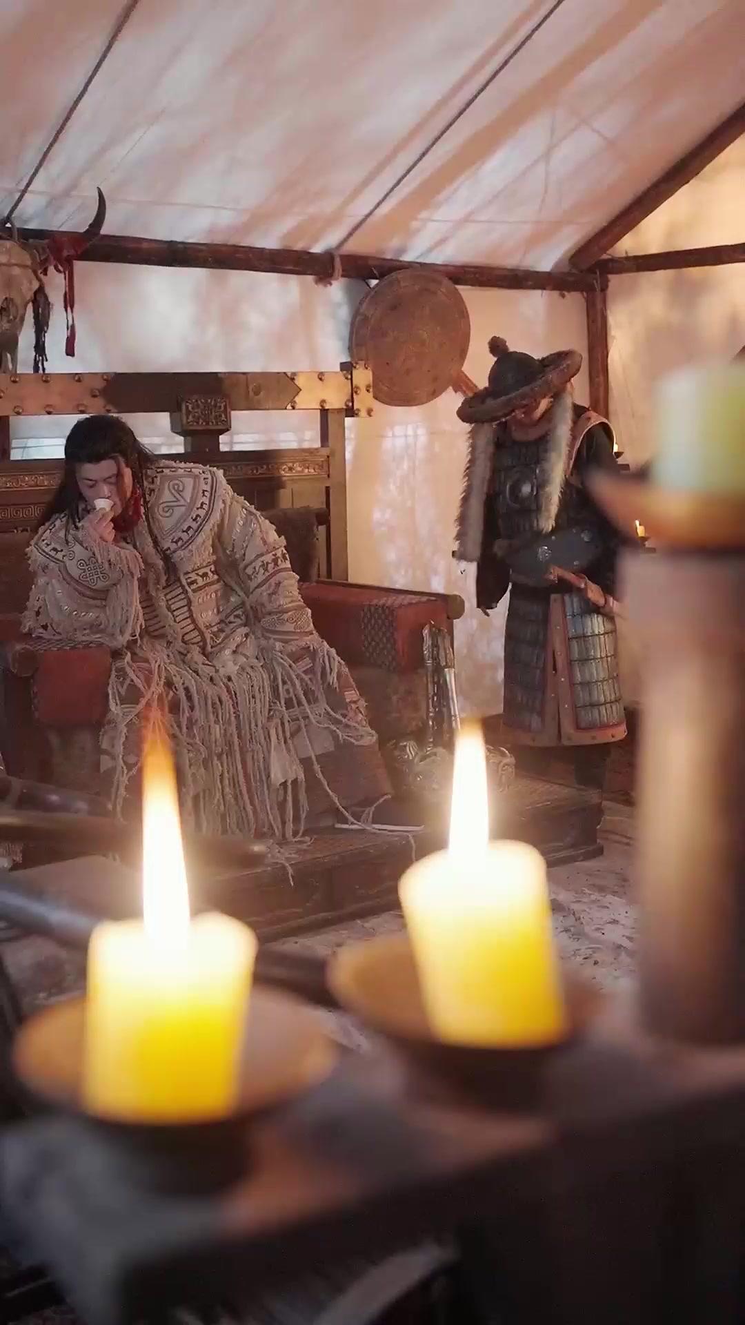 Let’s talk about the kind of scene that doesn’t need dialogue to scream its truth—that’s the magic of *Legacy of the Warborn*’s latest chapter. We open inside a yurt-like command tent, lit by nothing but candlelight that casts long, wavering silhouettes against stretched hide walls. At the center, Jin Wei reclines—not lazily, but with the controlled ease of a man who has long since stopped proving himself. His robe is extraordinary: layers of cream-colored wool, stitched with repeating motifs of deer in motion, geometric knots symbolizing eternity, and rows of shell-like discs that catch the flame’s glow like scattered coins. The fringes hang loose, some torn, some deliberately unraveled—this isn’t costume design for aesthetics alone; it’s visual language. Each thread tells of travel, of sacrifice, of rituals performed under moonlight. He lifts a small ceramic cup, white as bone, and drinks. Not greedily. Not dismissively. With the reverence of one who knows the liquid inside carries more than flavor—it carries obligation. His eyes, sharp beneath heavy brows, track the movement of Boru, the kneeling warrior whose armor is both protection and prison. Boru’s hat, broad and fur-lined, hides half his face, but his eyes—dark, watchful, weary—betray everything. He grips his sword not as a threat, but as an anchor. When Jin Wei finally rises, the shift is seismic. He doesn’t shout. He doesn’t gesture wildly. He simply spreads his arms, letting the robe’s fringes fall like banners, and speaks—though we don’t hear the words, we feel their weight in the way Boru’s jaw tightens, the way the second guard behind him shifts his stance from deference to readiness. This is leadership not as command, but as burden. Jin Wei isn’t asking for obedience; he’s reminding them of debt. And in *Legacy of the Warborn*, debt is the true currency of power. The scene ends not with resolution, but with rupture—a sudden cut to black, followed by the soft rustle of silk and the metallic tang of blood.