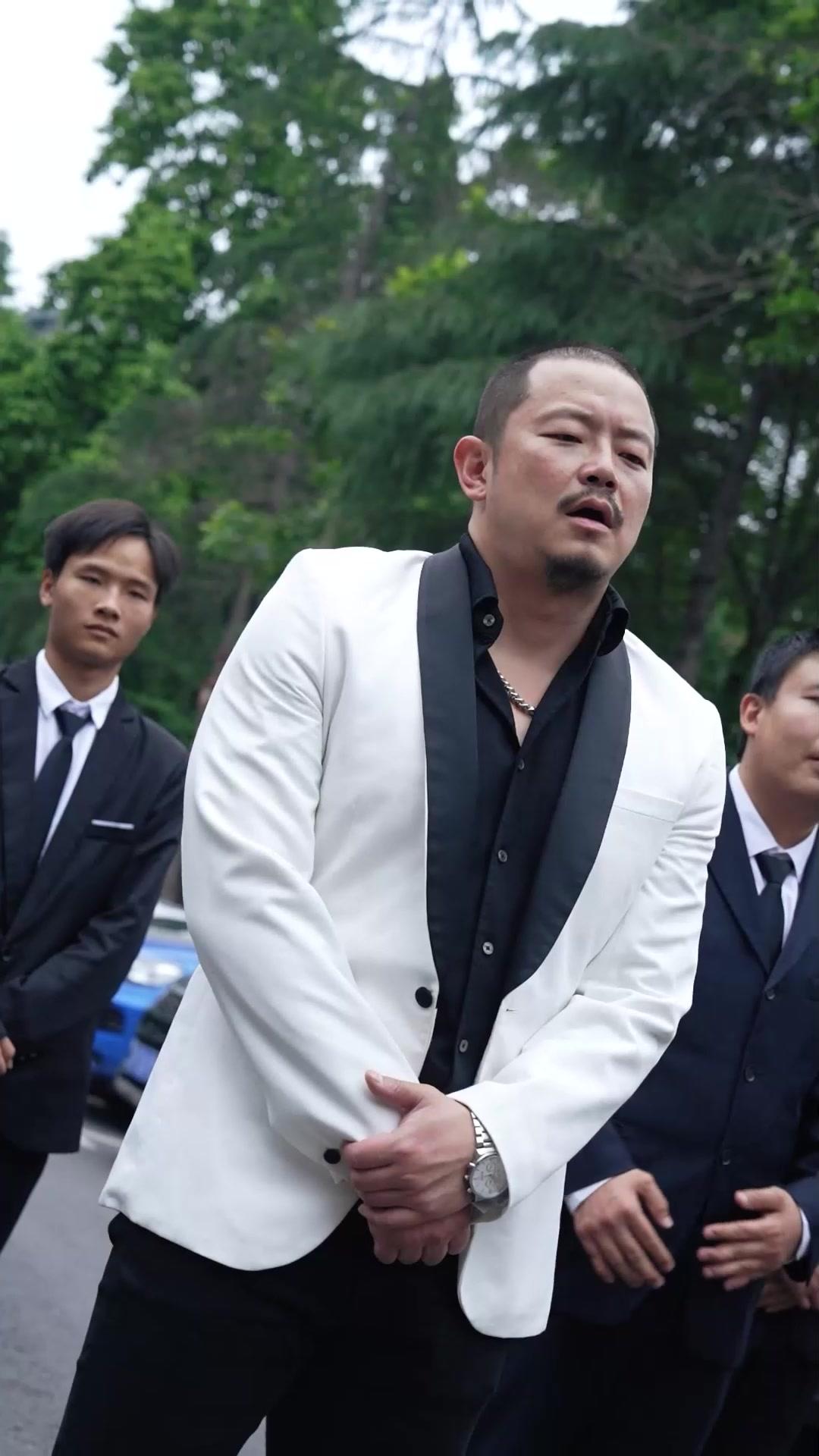 In the opening frames of *Legend of a Security Guard*, we are thrust into a world where formality is armor and silence speaks louder than shouting. The central figure—let’s call him Brother Lin, though his name is never spoken aloud—stands with hands clasped low, fingers interlaced like a man bracing for impact. His white tuxedo jacket, stark against the black lapels and shirt beneath, isn’t just fashion; it’s a declaration. He wears it not as celebration but as surrender—a uniform of submission disguised as elegance. Around him, six men in identical navy suits stand like statues, their postures rigid, eyes fixed forward, yet never quite meeting his. They are not bodyguards. They are witnesses. And in that courtyard, flanked by parked sedans and a van marked with faded license plates, something far more delicate than violence is unfolding.