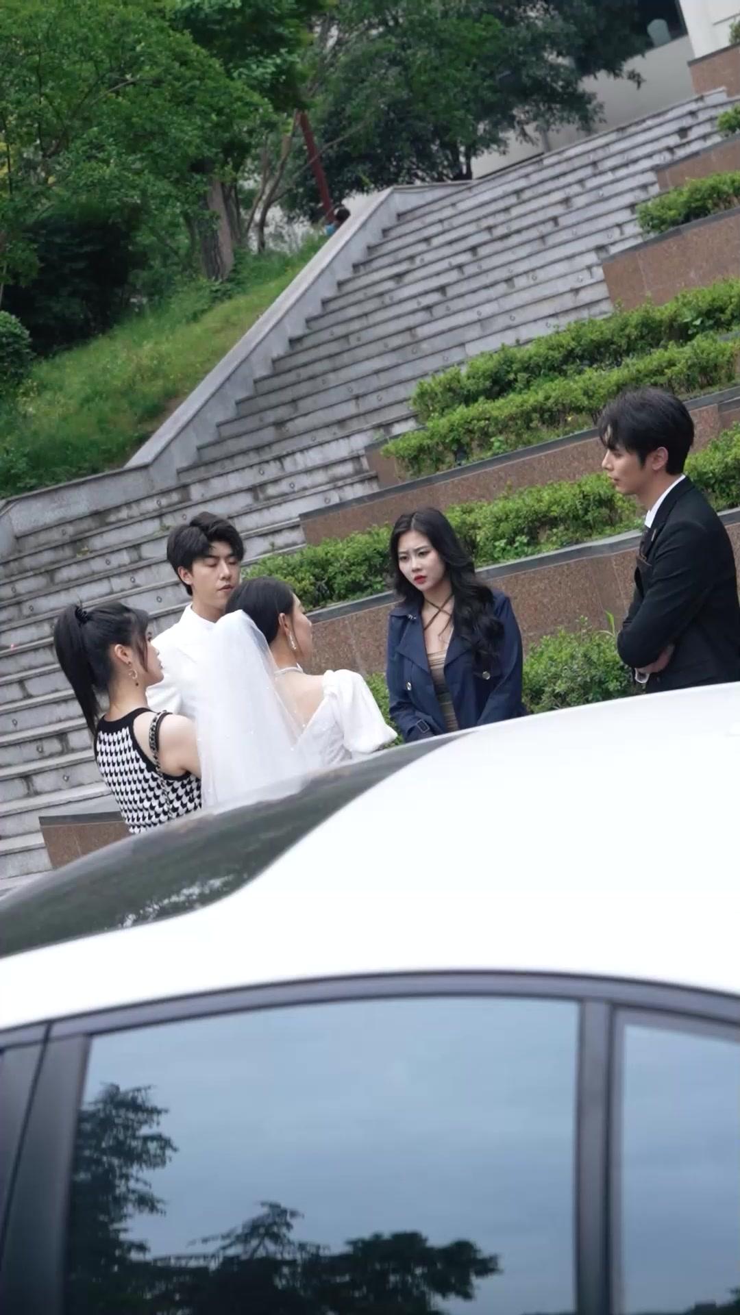 The opening shot of *Legend of a Security Guard* is deceptively serene—a white sedan parked beneath tiered greenery, its roof gleaming under overcast light. But the calm shatters the moment the camera tilts upward to reveal five figures clustered like storm clouds around the vehicle. At the center stands Li Wei, dressed in an immaculate white double-breasted tuxedo, his bowtie crisp, his posture rigid—yet his eyes betray a flicker of hesitation. To his left, Chen Xiao, the bride, wears a modern ivory gown with puffed sleeves and a delicate veil, her pearl choker catching the diffused daylight like scattered diamonds. A red ribbon pinned to her chest—embroidered with golden ‘Xi’ characters—should symbolize joy, but instead it hangs heavy, almost accusatory. Beside her, Lin Mei, in a houndstooth mini-dress and gold bangles, crosses her arms with practiced defiance, her gaze darting between Li Wei and the woman opposite them: Su Yan, whose navy trench coat flutters slightly in the breeze, long black hair cascading like ink spilled across parchment. Her expression is unreadable—part sorrow, part calculation—and she holds a crumpled white handkerchief as if it were evidence.