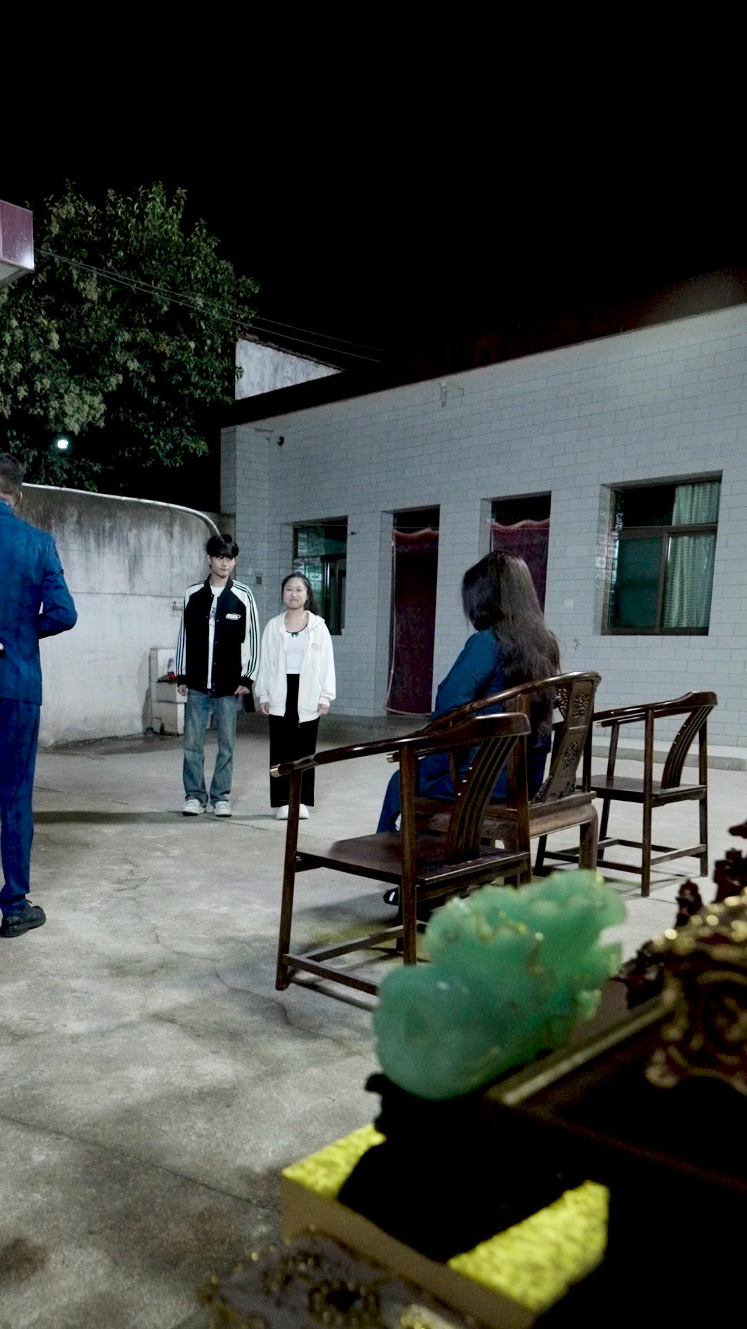 In the dimly lit courtyard of what appears to be a rural compound—concrete floor cracked, white brick walls weathered, a single air conditioner humming in the background—the tension doesn’t come from explosions or sword clashes. It comes from silence. From the way Lin Xiao’s fingers tremble just slightly as she steps down the stone stairs, her ivory gown shimmering under the harsh overhead light like liquid moonlight caught in spider silk. Her dress is not merely ornate; it’s a declaration. Sequins, pearls, embroidered phoenixes with wings stitched in gold thread—they don’t just decorate her body; they weigh it down, anchoring her to a fate she seems both resigned to and quietly resisting. Every step she takes is measured, deliberate, as if walking on glass. And yet, when she lifts her eyes—not toward the man seated in the carved wooden chair, but toward the young man in the black-and-white varsity jacket standing rigid beside her companion—something flickers. A micro-expression. Not fear. Not hope. Something sharper: recognition. Or perhaps regret.