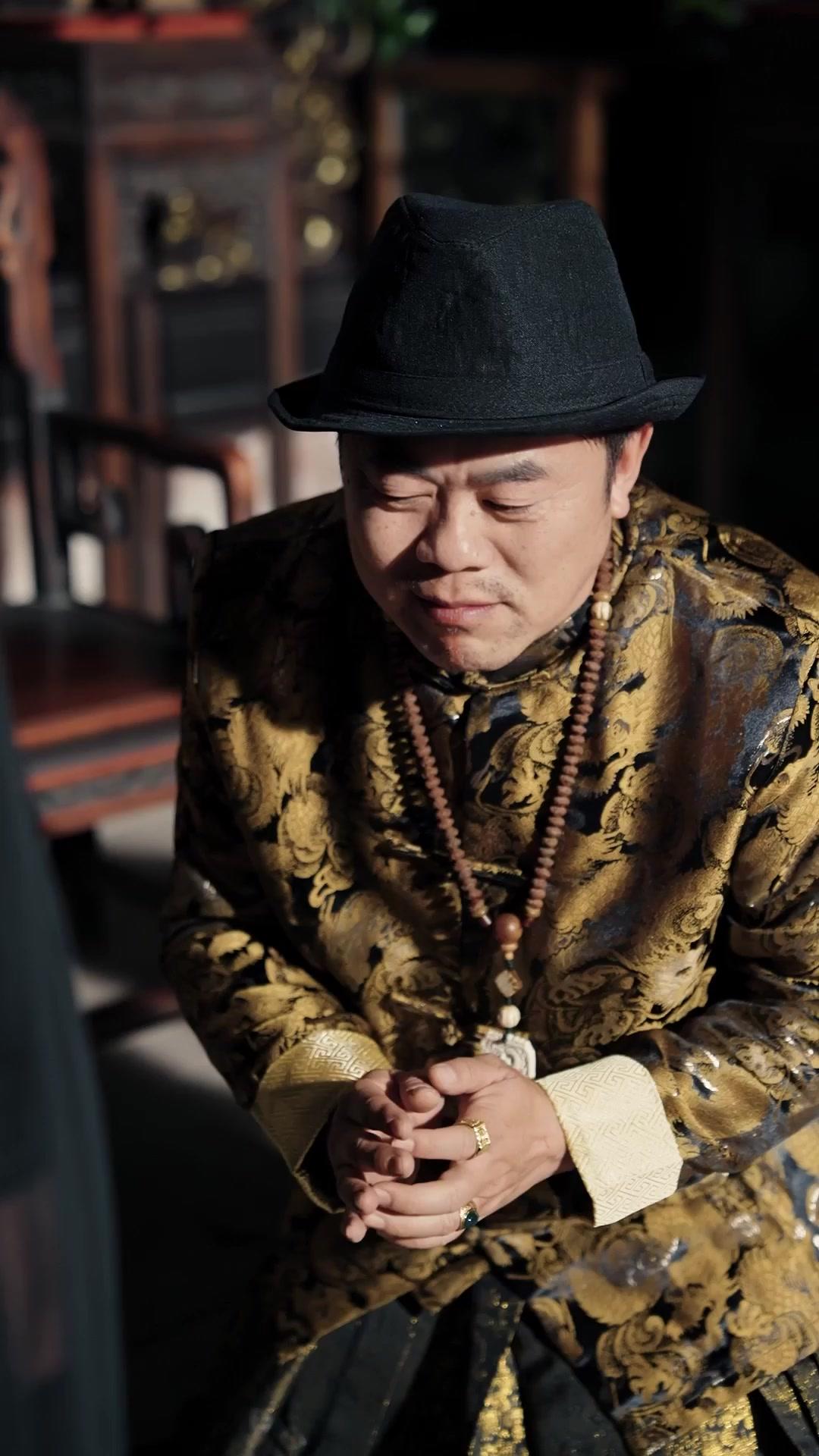 In a dimly lit, ornately carved chamber where sunlight slices through latticework like divine judgment, two men orbit each other with the tension of a clockwork trap about to snap. One—Loser Master, clad in a brocade robe shimmering with golden dragons, his fingers heavy with rings, his posture a paradox of supplication and calculation—kneels not in humility but in strategy. His black fedora casts a shadow over eyes that flicker between fear and cunning, as if he’s rehearsing three different lies at once. Around his neck hangs a wooden prayer bead strand, its pendant a blank jade tablet—perhaps a symbol of erased identity, or maybe just a prop for theatrical piety. Every gesture he makes is calibrated: clasped hands tremble slightly, not from weakness, but from the effort of holding back laughter—or rage. When he rises, it’s not with dignity, but with the jerky momentum of a puppet whose strings have just been tugged by an unseen hand. His smile, when it finally breaks across his face, is too wide, too white, too *late*—a mask slipping just enough to reveal the gears turning behind it.