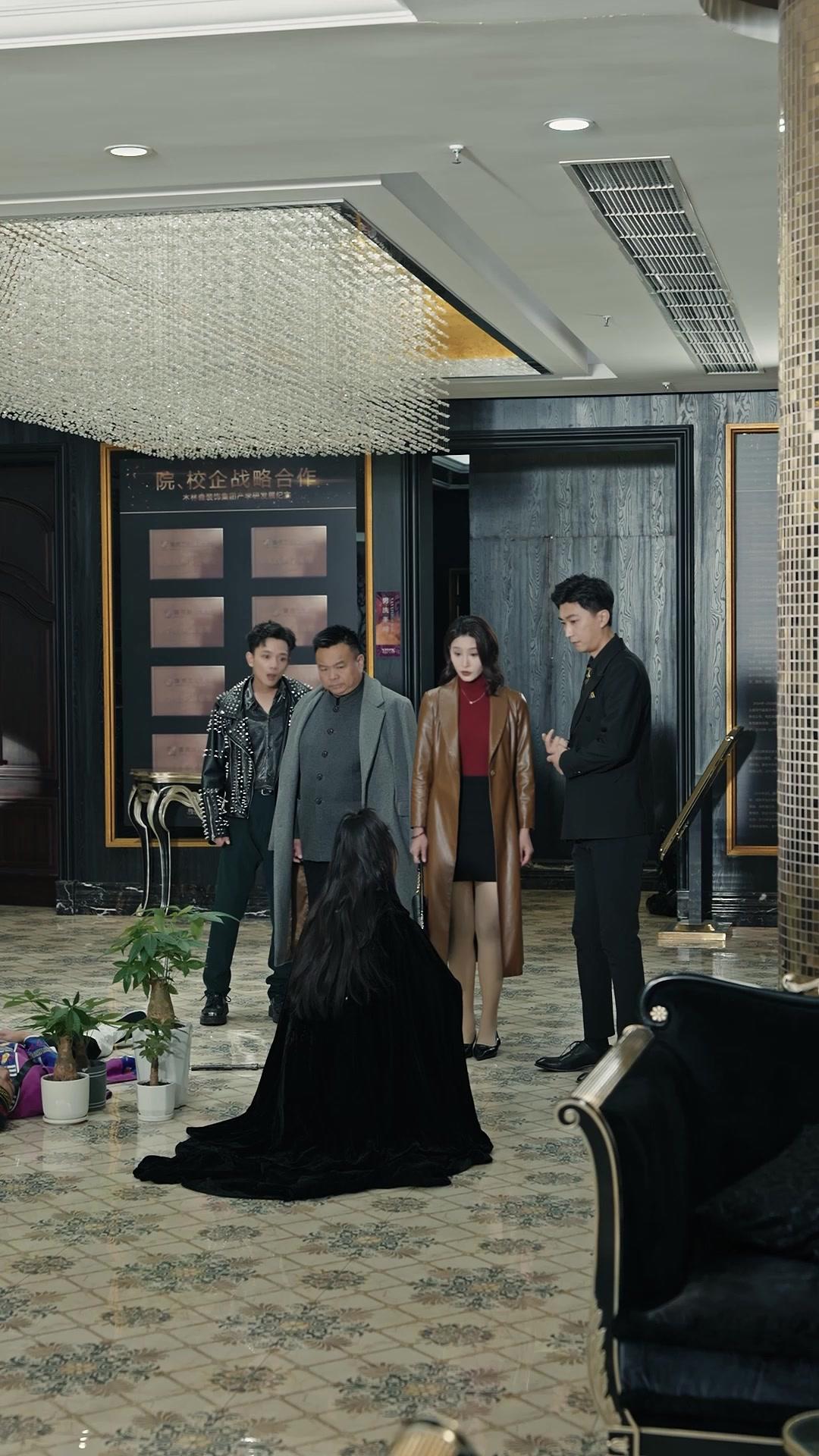 What makes this scene unforgettable is how the environment participates. The tiled floor reflects their figures like fractured mirrors. Potted plants sit ignored near discarded luggage—a visual metaphor for abandoned plans, forgotten baggage. Behind them, a framed plaque reads “Institute-Enterprise Strategic Cooperation,” a bureaucratic phrase that feels absurdly ironic given the raw human drama unfolding before it. The contrast is intentional: institutional order versus emotional chaos. And yet, the characters don’t rebel against the setting—they *use* it. Jingyi leans slightly against a pillar, grounding herself. The kneeling woman (we’ll call her Xue, for the frost-like clarity in her gaze) steps forward until her cape brushes the edge of a velvet armchair, claiming territory not with force, but with presence. The lighting, too, plays a role: warm vertical strips behind the men cast long shadows, while cool overhead light bathes the women in clarity—no hiding, no softening.