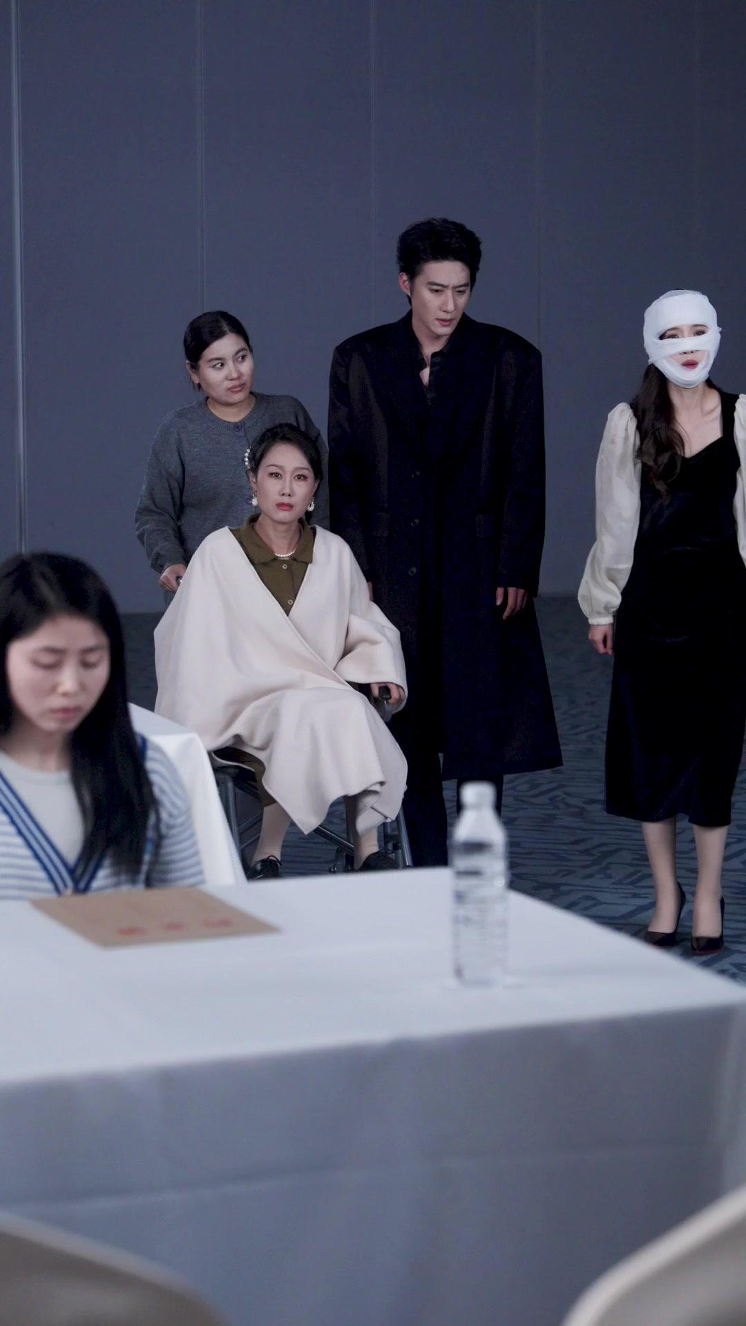 The scene opens with a tableau that feels less like a meeting and more like a tribunal. A woman wrapped in white gauze—her face obscured, only her lips visible, painted red as if defiantly alive—enters flanked by two men: one in a sleek black coat (Zhou Yan), his expression unreadable but his posture rigid with suppressed fury; the other, a plain-clothed officer, gripping Chen Wei’s arm with quiet authority. The contrast is jarring: the bandaged woman moves with fragile grace, while Chen Wei stumbles forward, his suit rumpled, his eyes darting between Lin Xiao and the documents scattered across the table. A water bottle sits untouched beside a blue folder—its presence almost mocking, a symbol of normalcy in a world that has just cracked open.