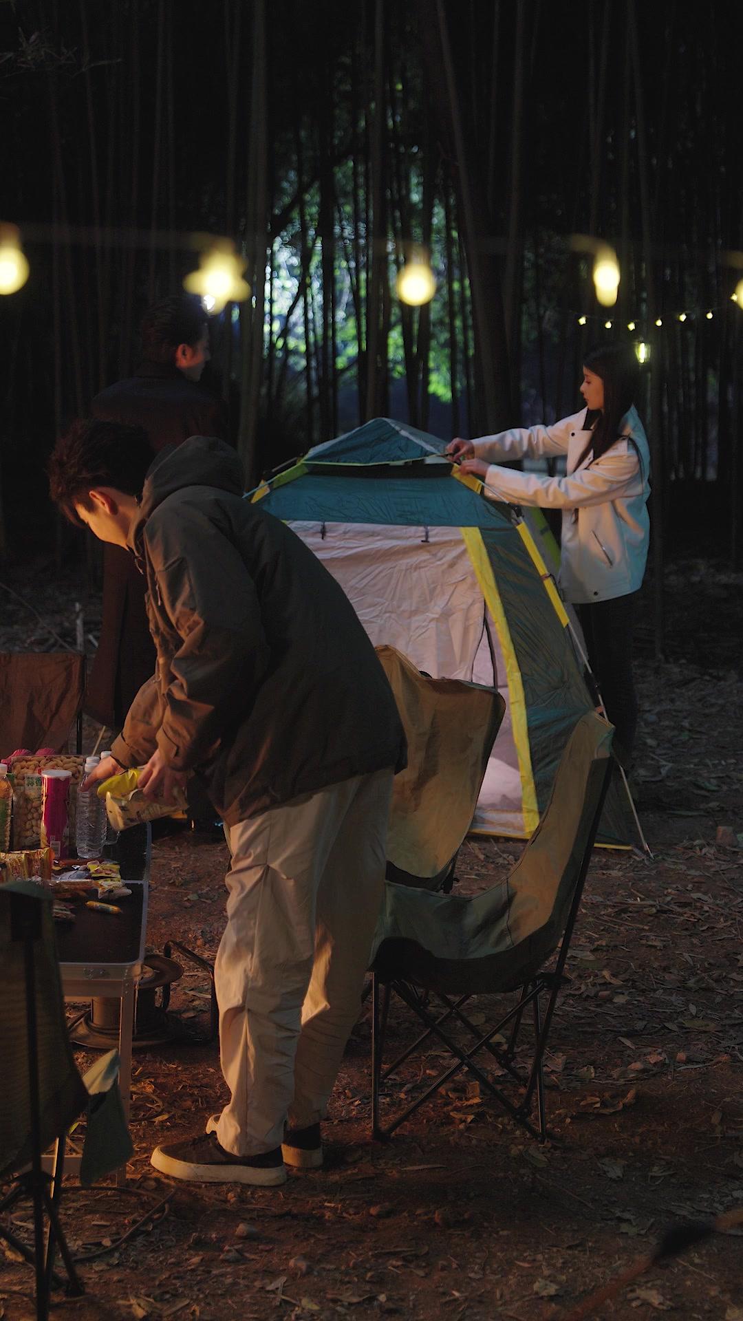 The forest at night breathes with a quiet tension—strings of warm fairy lights hang like fragile promises between bamboo stalks, casting soft halos over a modest green-and-yellow tent. Inside this seemingly idyllic camping setup, three people orbit each other in a choreography of proximity and avoidance, where every gesture carries weight, every glance hides a confession. This is not just a weekend getaway; it’s a psychological triptych unfolding under the flicker of firelight and the weight of unspoken truths. Love in Ashes, as the title suggests, doesn’t begin with flames—it begins with embers already smoldering beneath the surface, waiting for the right spark to ignite or extinguish everything.