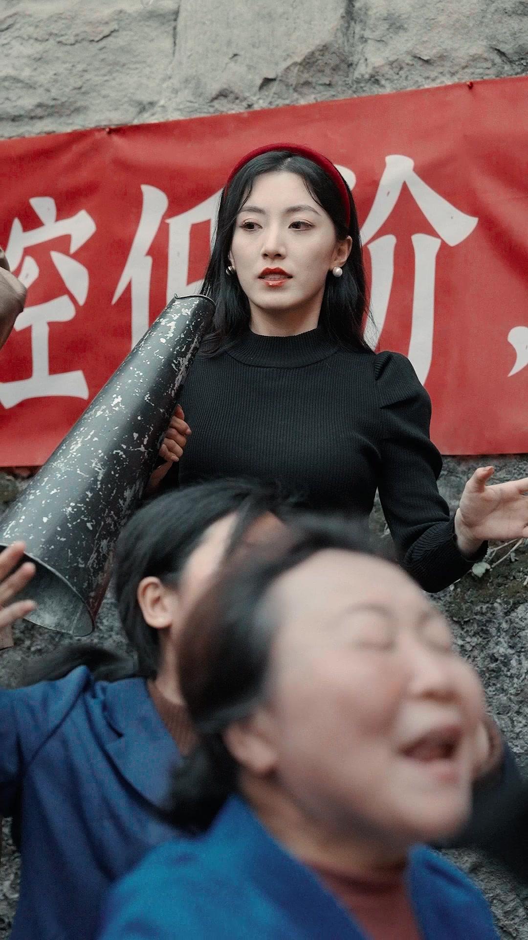 The setting reinforces the tension between tradition and transition. The stone wall is ancient; the red banners are modern propaganda tools. The wooden carts are handmade; the megaphone is industrial. Even the clothing tells a story: Lin Xiaoyu’s outfit is stylish, almost urban—yet she’s standing in a village alley where most wear practical, muted tones. She’s an anomaly, and the crowd reacts accordingly: some lean in, fascinated; others pull back, suspicious. Her pearl earrings catch the light—a tiny rebellion against austerity. Her red headband isn’t just fashion; it’s a flag. In ONE MORE LIFE IN 1984, color is never accidental. Red means passion, danger, revolution. Black means control, mystery, resistance. Blue means labor, conformity, the collective. When Lin Xiaoyu crosses her arms, the contrast between her black sleeves and red skirt becomes a visual thesis statement.