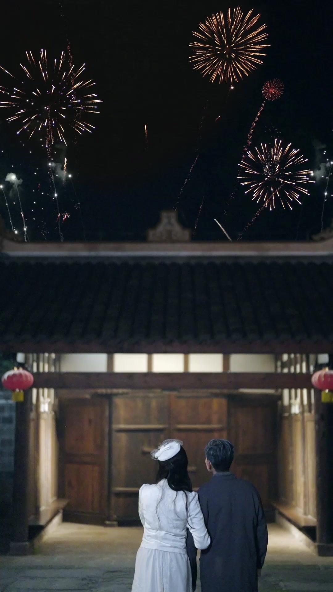 The opening shot of *Pearl in the Storm* is deceptively serene—a couple, Li Wei and Xiao Man, stand beneath a traditional courtyard gate, backs to the camera, gazing upward as fireworks explode in synchronized bursts above them. The sky is a canvas of gold and crimson, each burst momentarily illuminating the ornate roofline and the red lanterns flanking the entrance. But this isn’t just celebration; it’s performance. Xiao Man raises her hand—not in awe, but in deliberate gesture, pointing toward a specific firework, her posture poised, almost rehearsed. Li Wei stands beside her, his arm loosely around her waist, his expression calm but distant, eyes fixed not on the spectacle, but on her profile. There’s no spontaneous joy here. This is a moment staged for memory, for posterity, for someone watching from the shadows. And indeed, moments later, we see that someone: an older man with silver-streaked hair, crouched low, holding a vintage Leica camera—its chrome body gleaming under the ambient light. He doesn’t smile. He observes. His finger hovers over the shutter release like a surgeon’s scalpel. That single frame tells us everything: this family gathering is not casual. It’s curated. Every glance, every step, every adjustment of a sleeve or tilt of a head is being recorded, judged, preserved—or perhaps, manipulated.