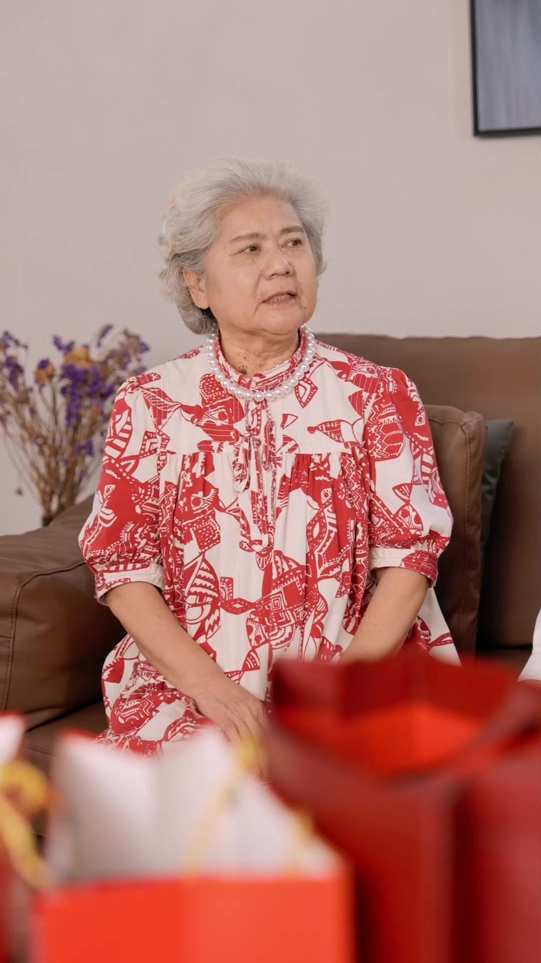 Grandma Lin sets the tone immediately. She doesn’t rise to greet anyone. She remains seated, spine straight, eyes scanning the room like a general reviewing troops before battle. Her red-and-white dress isn’t festive—it’s armor. The patterns aren’t decorative; they’re heraldic. When she extends her hand—not to shake, but to *indicate*—it’s a command disguised as courtesy. Her voice, though unheard in the silent frames, is written in the set of her shoulders, the slight lift of her chin. She’s the architect of this gathering, and every person present knows they’re walking on floorboards she sanded herself. Her pearl necklace isn’t jewelry; it’s a badge of authority, passed down, polished, worn thin at the edges from years of use in moments just like this.