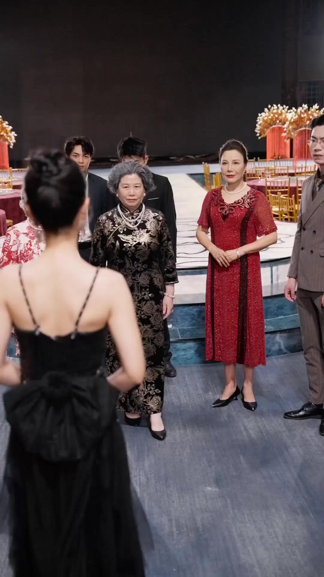 Let’s begin with Madame Lin—the matriarch in black velvet and gold florals. Her hair, silver-streaked and perfectly coiffed, is less a sign of age than of authority. She doesn’t speak much in these frames, yet every micro-expression is a paragraph. When Amy Clark steps forward—back to camera, then turning slowly, revealing that sequined gown like armor forged in midnight—the elder’s lips part. Not in surprise. In recollection. Her hand lifts, just slightly, toward her throat, where the triple-strand pearls rest. A habitual gesture? Or a subconscious invocation? In Chinese symbolism, pearls represent wisdom earned through suffering; three strands signify heaven, earth, and humanity. Madame Lin isn’t just wearing jewelry. She’s wearing doctrine. And when she later gestures toward the red-dressed woman beside her—perhaps her daughter, perhaps her rival—the motion is both protective and possessive, as if shielding a flame from wind while ensuring it burns only for her chosen purpose.