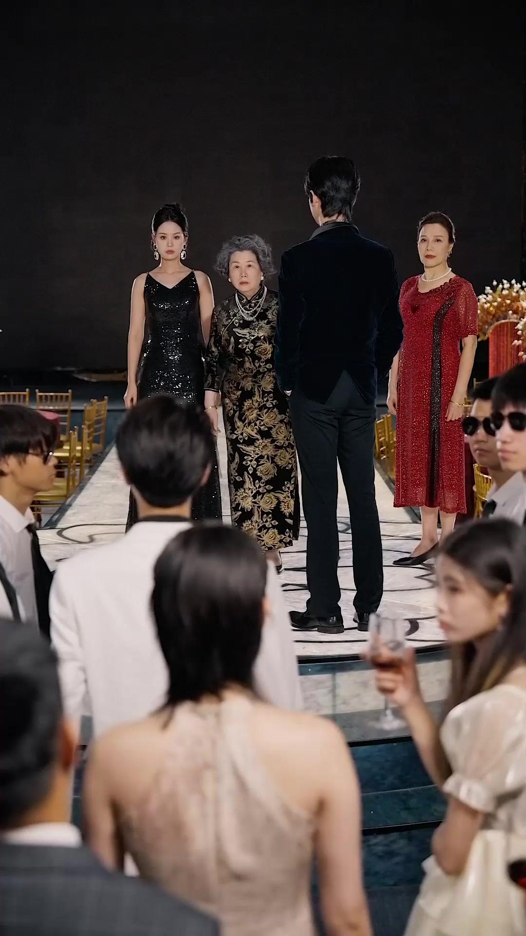The setting is a banquet hall that feels less like a venue and more like a courtroom with better lighting. Gold filigree adorns the ceiling, but the real architecture is psychological: every chair placement, every floral arrangement, every sip of wine is choreographed. Lin Xue, in her black sequined gown, stands like a statue carved from midnight—her shoulders squared, her chin lifted, her earrings (those dazzling, geometric drops of black onyx and crystal) catching the light like surveillance cameras. She doesn’t need to speak to dominate the space. Her presence is a rebuttal. To Zhou Yi’s return. To Elder Madame Chen’s accusations. To the entire narrative that painted her as the villain who stole her ex’s uncle’s affection—and then vanished, only to reappear, reborn, with a new name, a new fortune, and a dossier thicker than a family Bible.