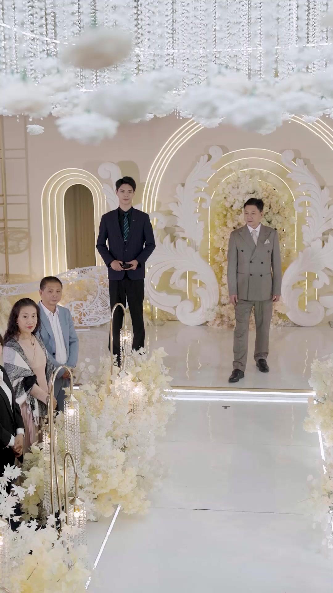 The wedding venue in Rise of the Fallen Lord is not a setting—it is a character. White marble floors reflect not just light, but intention. Suspended clouds, crafted from spun polyester and LED filaments, drift lazily above like forgotten dreams given form. And at the heart of it all, the archway: three concentric rings of warm neon, pulsing faintly, framing the couple like a halo around a paradox. This is where Li Wei, masked and immaculate in black velvet lapels and a golden eagle pin, walks arm-in-arm with Xiao Lin, whose gown shimmers with sequins arranged in fractal patterns—each motif echoing the geometry of the arch behind them. But what makes this sequence unforgettable is not the spectacle; it is the dissonance. The guests clap, yes—but their applause is measured, polite, almost hesitant. Their eyes dart between the couple and the officiant, Chen Hao, who stands slightly off-center, microphone in hand, watching not the ritual, but the *reaction*. He knows something the others only suspect. When the camera cuts to the man in the front row—short hair, navy suit, lips parted mid-sentence—he isn’t speaking to his wife beside him. He’s murmuring to the air, as if testing a theory aloud: ‘He didn’t choose the mask for drama. He chose it so she’d have to look *past* it to see him.’ That line, though unheard, resonates through the entire sequence. Because Xiao Lin *does* look past it. Not with impatience, but with a kind of sacred patience. Her gaze lingers on the curve of his jawline visible beneath the mask’s lower edge, on the way his thumb brushes her knuckle when he adjusts his grip—not possessively, but as if recalibrating their shared frequency. The mask itself is a masterpiece of contradiction: black lacquer etched with silver filigree resembling both dragon scales and shattered stained glass. It covers everything except his eyes—and even those are partially obscured by the ornate brow piece. Yet, somehow, we feel his presence more intensely than if he were fully exposed. That is the genius of Rise of the Fallen Lord: it weaponizes ambiguity not to confuse, but to deepen. Every gesture is layered. When Chen Hao asks, ‘Do you take this person—not as they appear, but as they choose to reveal themselves?’ the question hangs, heavy, in the space between breaths. Li Wei doesn’t nod. He exhales—once, slowly—and the mask shifts minutely, catching the light in a way that makes his eyes gleam like polished obsidian. Xiao Lin answers first, her voice clear, unhurried: ‘I do. Not despite the mask, but because of it.’ That line alone recontextualizes the entire ceremony. The mask is no longer a barrier; it is the very condition of their covenant. The audience stirs—not with shock, but with dawning realization. A young woman in the third row, wearing a black dress with a Peter Pan collar, stops clapping. Her hands hover mid-air, fingers splayed, as if she’s just touched something electric. She turns to her friend and says, barely audible, ‘He’s not hiding. He’s inviting her in.’ And that is the core thesis of Rise of the Fallen Lord: intimacy is not the removal of walls, but the mutual agreement to build a door. The floral arrangements lining the aisle aren’t just decoration—they’re metaphors in bloom. Cream-colored proteas, symbolizing dignity and resilience, stand sentinel beside trailing ivy, representing enduring connection. Even the candle holders—gold arcs cradling crystal teardrops—suggest both mourning and celebration, loss and rebirth, all held in balance. When Li Wei finally reaches for Xiao Lin’s hand to place the ring, his movements are deliberate, unhurried. His wrist bears a thin silver band, hidden beneath his cuff—a detail only visible in close-up, a secret sigil. She notices. Her eyelids flutter, just once. Not surprise. Recognition. As if she’s seen that band before, in another life, another version of this moment. Chen Hao watches this exchange, his expression unreadable—until he smiles, small and private, as if confirming a long-held suspicion. His role is not to preside, but to witness. To hold space for the unsaid. And in that space, Rise of the Fallen Lord blooms. The final shot lingers on Xiao Lin’s face as she looks up at Li Wei—not with adoration, but with quiet awe. Her lips part, not to speak, but to breathe in the weight of what they’ve just agreed to carry together. The mask remains. The ring is on her finger. The lights dim slightly, not in closure, but in invitation. This is not an ending. It is the first true meeting. The fallen lord does not rise to throne or glory—he rises to accountability, to visibility on his own terms, and to love that demands nothing less than full honesty, even when honesty wears a mask. In a genre saturated with grand confessions and tearful reconciliations, Rise of the Fallen Lord dares to suggest that the deepest bonds are forged not in revelation, but in *witnessing*. And as the camera pulls back, revealing the full tableau—the couple framed by light, the guests holding their breath, the clouds still drifting overhead—one understands: the most radical act in modern romance is not saying ‘I love you,’ but saying, ‘Here I am. Take me as I choose to show myself.’ That is the legacy of Li Wei and Xiao Lin. That is the rise.