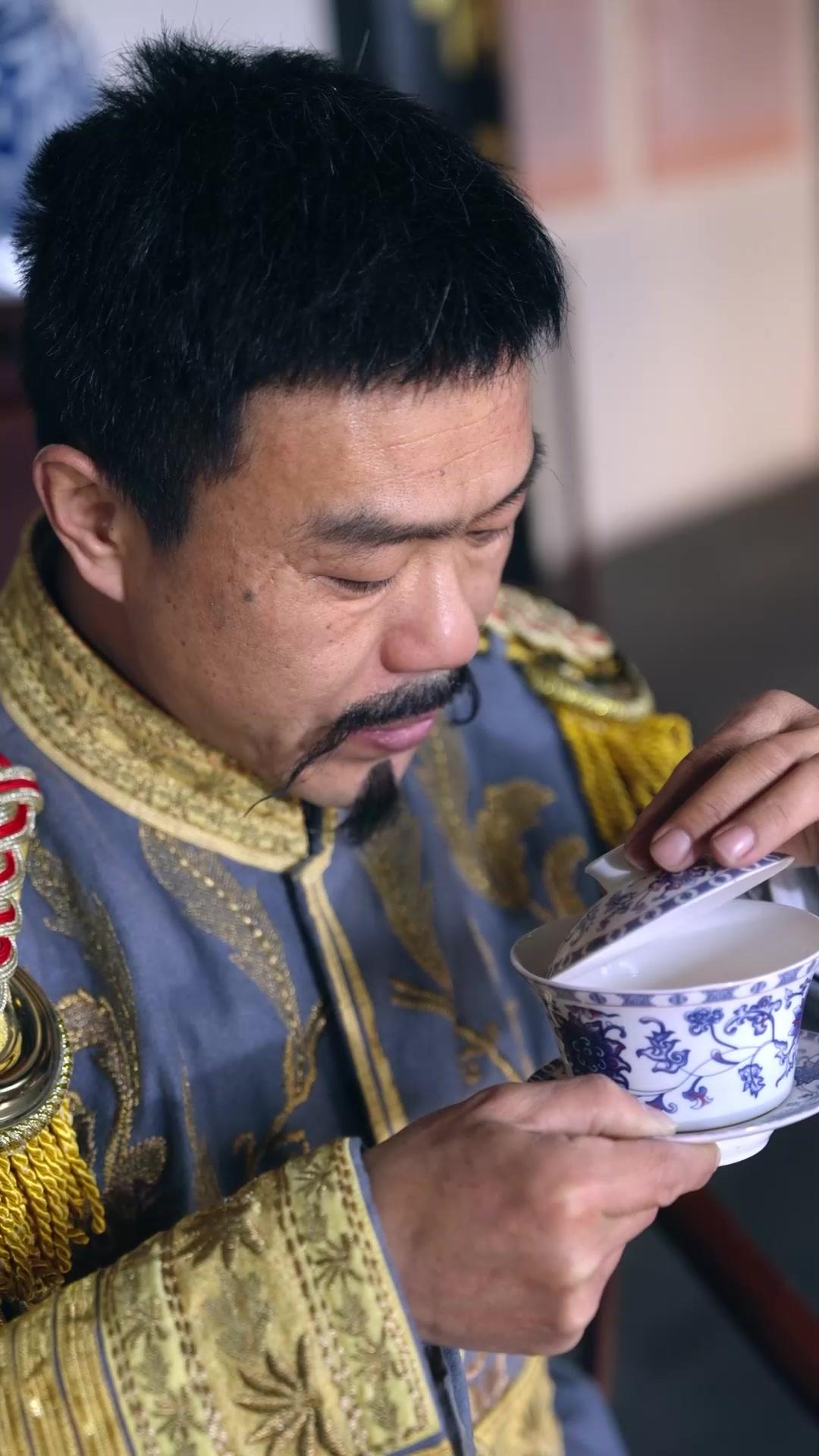 In the opening frames of *Sword of the Hidden Heart*, we’re not just watching a man sip tea—we’re witnessing the quiet detonation of a carefully constructed facade. General Lin, played with astonishing nuance by actor Zhang Wei, sits in that ornate blue-and-gold uniform like a statue carved from imperial porcelain—every thread, every tassel, every embroidered phoenix screaming authority and tradition. Yet his hands tremble slightly as he lifts the delicate blue-and-white gaiwan. His mustache, meticulously shaped into twin hooks, quivers—not from age, but from anticipation. He doesn’t drink immediately. He inhales the steam, eyes half-closed, as if trying to extract not just aroma, but truth, from the leaves swirling beneath the lid. That moment is pure cinematic alchemy: a single gesture revealing more than ten pages of exposition ever could. He’s not sipping tea; he’s tasting fate.