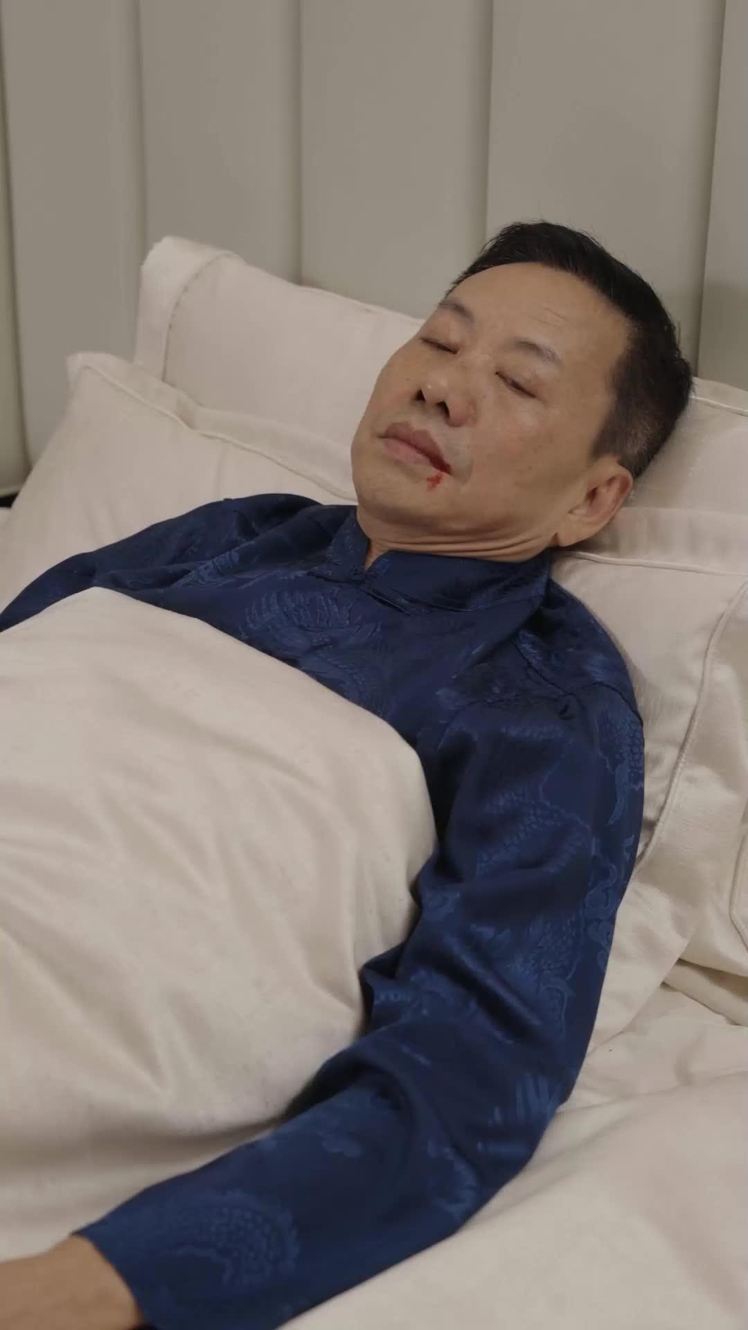 There’s a particular kind of horror that doesn’t scream—it *whispers*, while the blood pools quietly on satin sheets. *The Barbecue Throne: A Hero's Awakening* opens not with fanfare, but with stillness: Elder Lin, propped against ivory pillows, mouth smeared with crimson, eyes half-lidded, breathing like a man who’s already negotiated his surrender. Yet his stillness is deceptive. It’s the calm before the storm that’s been brewing for decades—inside the walls of this luxurious bedroom, inside the silences between family members, inside the unspoken oaths that bind them tighter than any legal contract. This isn’t a medical emergency. It’s a *ritual*. And everyone present knows their lines—even if they haven’t memorized them yet.