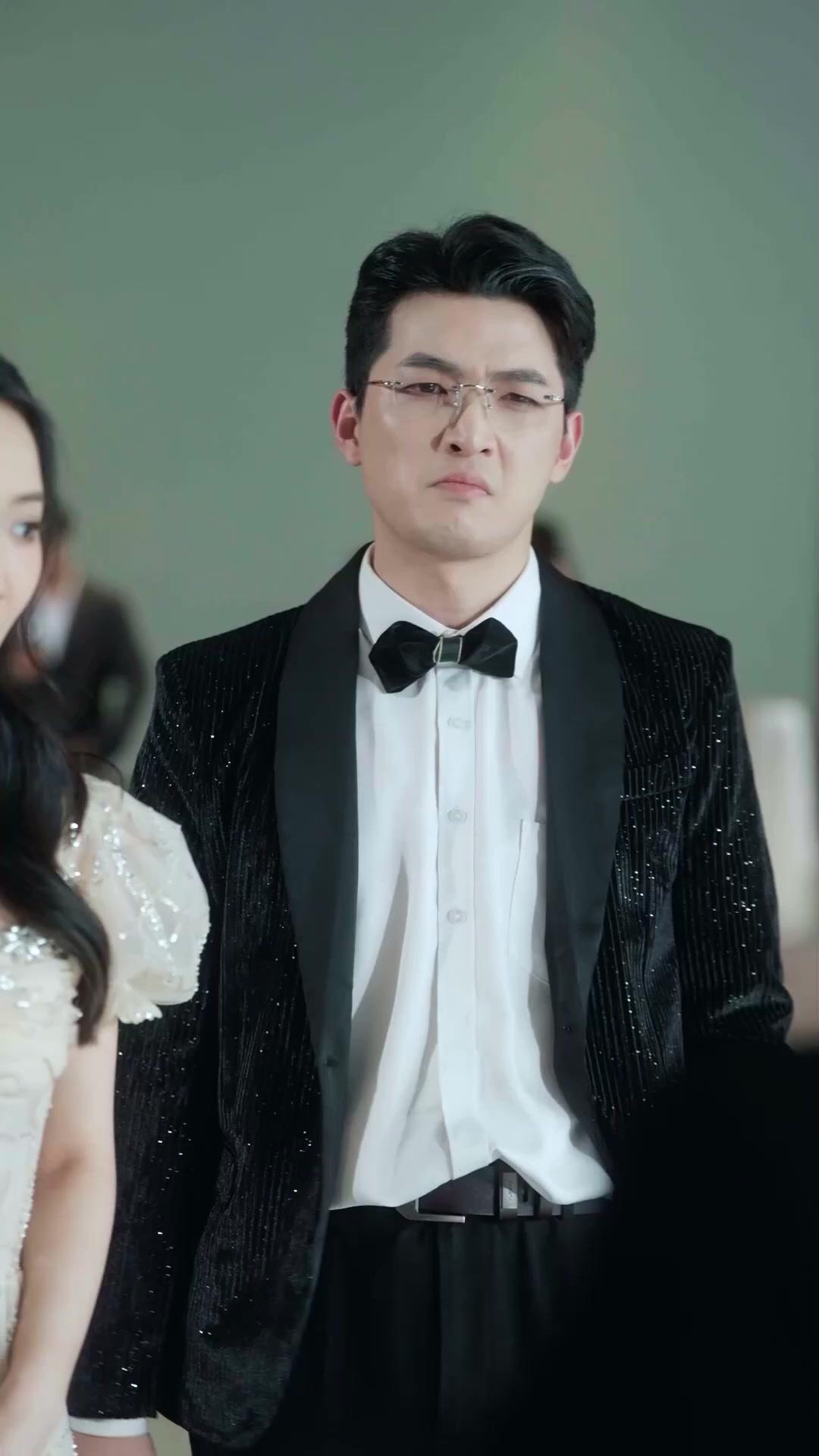 Chen Wei, in his black velvet tuxedo—sparkling faintly under the chandeliers like crushed obsidian—carries himself with the confidence of a man who’s never lost a negotiation. His glasses, thin-rimmed and immaculate, reflect the room back at him, as if he’s constantly reviewing the scene from multiple angles. But look closer: when Jiang Yu enters the frame, his jaw tightens. Not a flinch—no, that would be too crude—but a micro-tension in the tendons of his neck, visible only because the camera lingers just long enough. He doesn’t speak much in these early moments, yet his silence speaks volumes. He’s not ignoring Jiang Yu; he’s *measuring* her. Every time he glances away, it’s not disinterest—it’s strategy. He’s waiting for her to blink first.