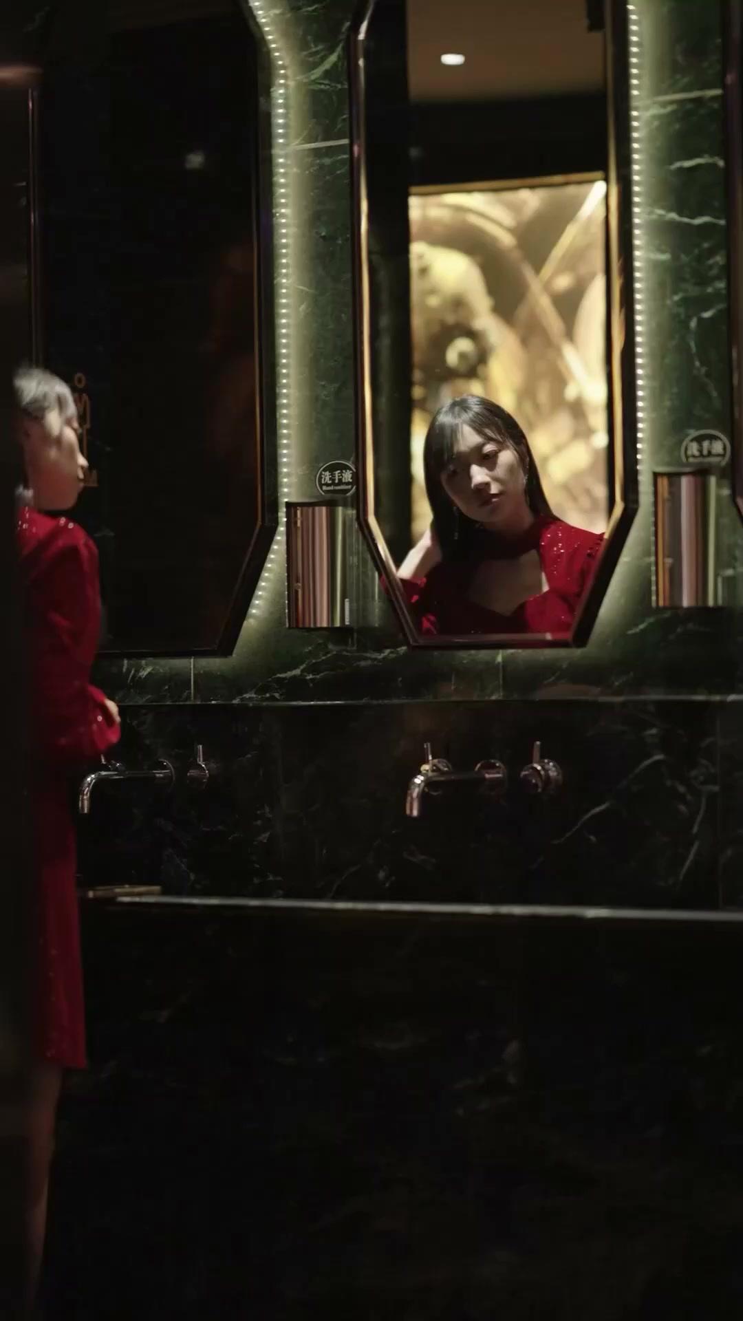There’s a particular kind of dread that settles in your chest when you realize the mirror isn’t reflecting reality—it’s reflecting *intent*. In *The Heiress's Reckoning*, that moment arrives at 00:04, when Chen Xiaoyu steps into frame, her pale qipao catching the edge of a spotlight like a ghost stepping into a crime scene. Lin Mei, already positioned at the sink, doesn’t turn. She doesn’t need to. She hears the soft scuff of sneakers on polished stone, the slight hitch in breath as Chen Xiaoyu approaches. The bathroom isn’t sterile—it’s curated. Green marble veins pulse under embedded LEDs, and the mirrors are segmented, fragmented, as if the space itself refuses to present a single, unified truth. That’s the genius of the set design: every surface tells a different version of the same story. Chen Xiaoyu sees herself in three angles at once—front, side, back—and none of them match the woman she feels she’s becoming.