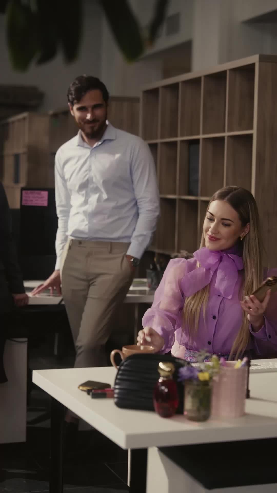 Let’s talk about the quiet earthquake that just happened in a modern office space draped with fairy lights and designer clutter—because what looked like a routine workday turned into a masterclass in class performance, emotional manipulation, and the kind of privilege that doesn’t announce itself; it just *arrives*. At first glance, Kate—yes, *that* Kate, the one in the sheer lavender blouse with the bow tie that screams ‘I read Vogue but also know how to pivot’—seems like the office’s resident aesthetic anomaly. She’s perched at her desk, sipping from a ceramic mug beside a black quilted clutch, a bottle of red perfume, and a tiny vase of wildflowers. Everything is curated. Even her posture is a statement: relaxed, but never slouching; confident, but never loud. Then she stands. And everything shifts.