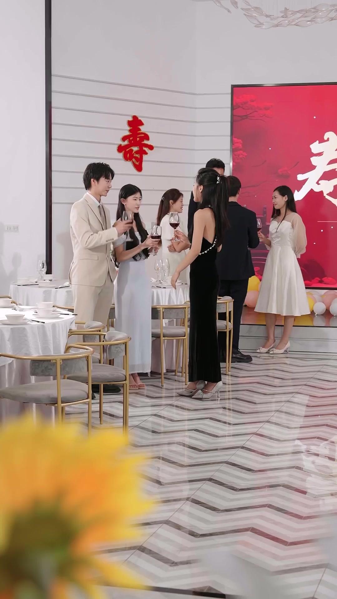 In the elegant, almost theatrical setting of a high-end banquet hall—white marble floors shimmering under soft LED strips, red Chinese characters for 'longevity' hanging like silent judges on the wall—the tension in Threads of Reunion doesn’t come from loud arguments or dramatic entrances. It comes from a glance, a hesitation, a clutch of a clutch bag that tightens just a fraction too much. Nancy Shea, introduced with on-screen text as ‘The Shea family’s daughter’, stands at the center of this quiet storm, dressed in a black velvet gown adorned with crystal embellishments at the neckline and waist—a costume that screams legacy, privilege, and control. Her smile is polished, her posture impeccable, but her eyes flicker when the woman in the silver off-shoulder gown enters. That woman—let’s call her Li Wei for now, though the video never names her outright—moves with a different kind of confidence: softer, more fluid, her dress catching light like liquid moonlight, her necklace a delicate chain of interlocking loops, not sharp jewels. She carries a small metallic clutch, fingers resting lightly on its clasp, as if it were both shield and weapon.