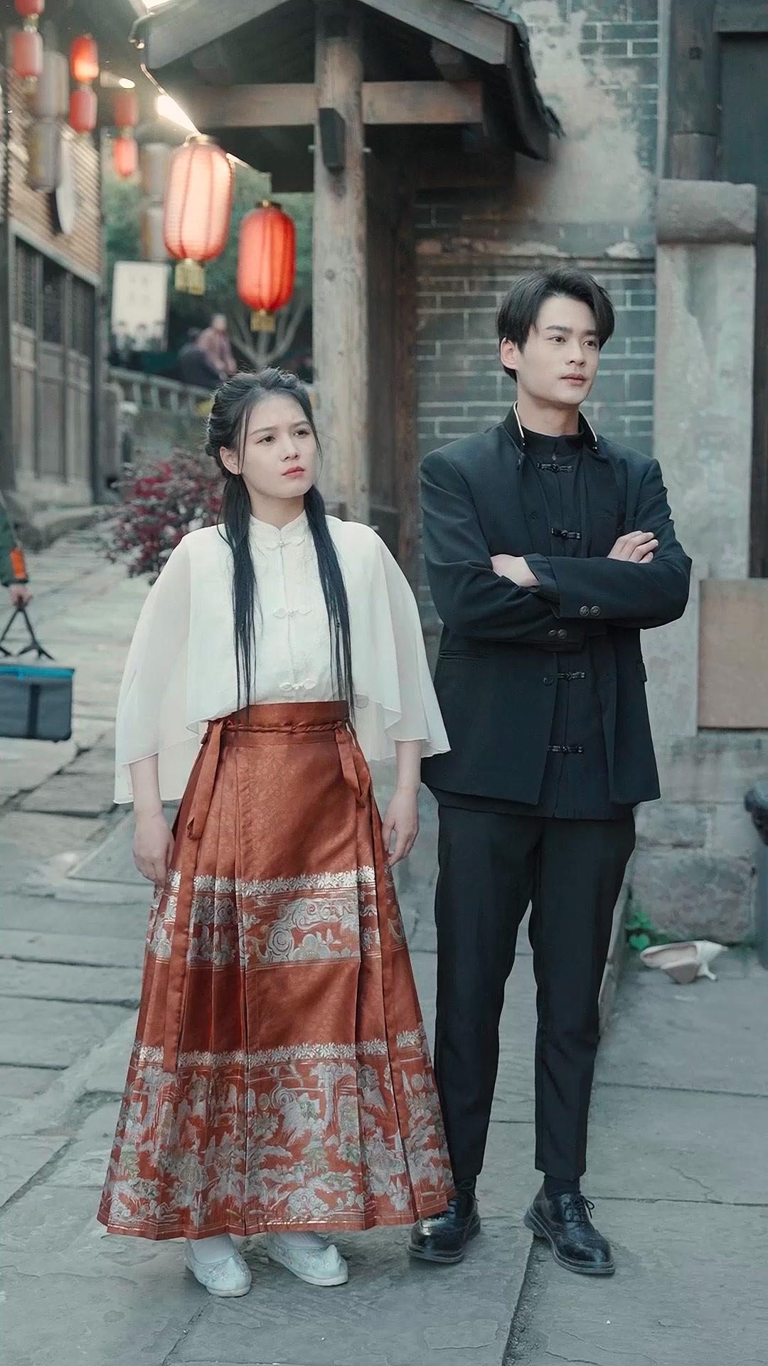 The man beside her—Zhou Wei, clad in a black Zhongshan-style jacket with white piping and frog closures—stands with arms crossed, eyes scanning the alleyway as if assessing threats rather than camera angles. His stillness is performative, yet his micro-expressions betray something deeper: he’s listening, not just to the script supervisor off-camera, but to the rhythm of the street itself—the clatter of distant carts, the murmur of extras in period garb, the faint chime of red lanterns swaying above. He doesn’t speak much in these frames, but when he does, his voice carries the weight of someone who’s memorized every line but still questions its truth. His gaze flickers toward Li Xue not with romance, but with recognition: *She sees it too.* The set isn’t just a backdrop; it’s a living entity, and they’re both trying to negotiate their place within its memory.