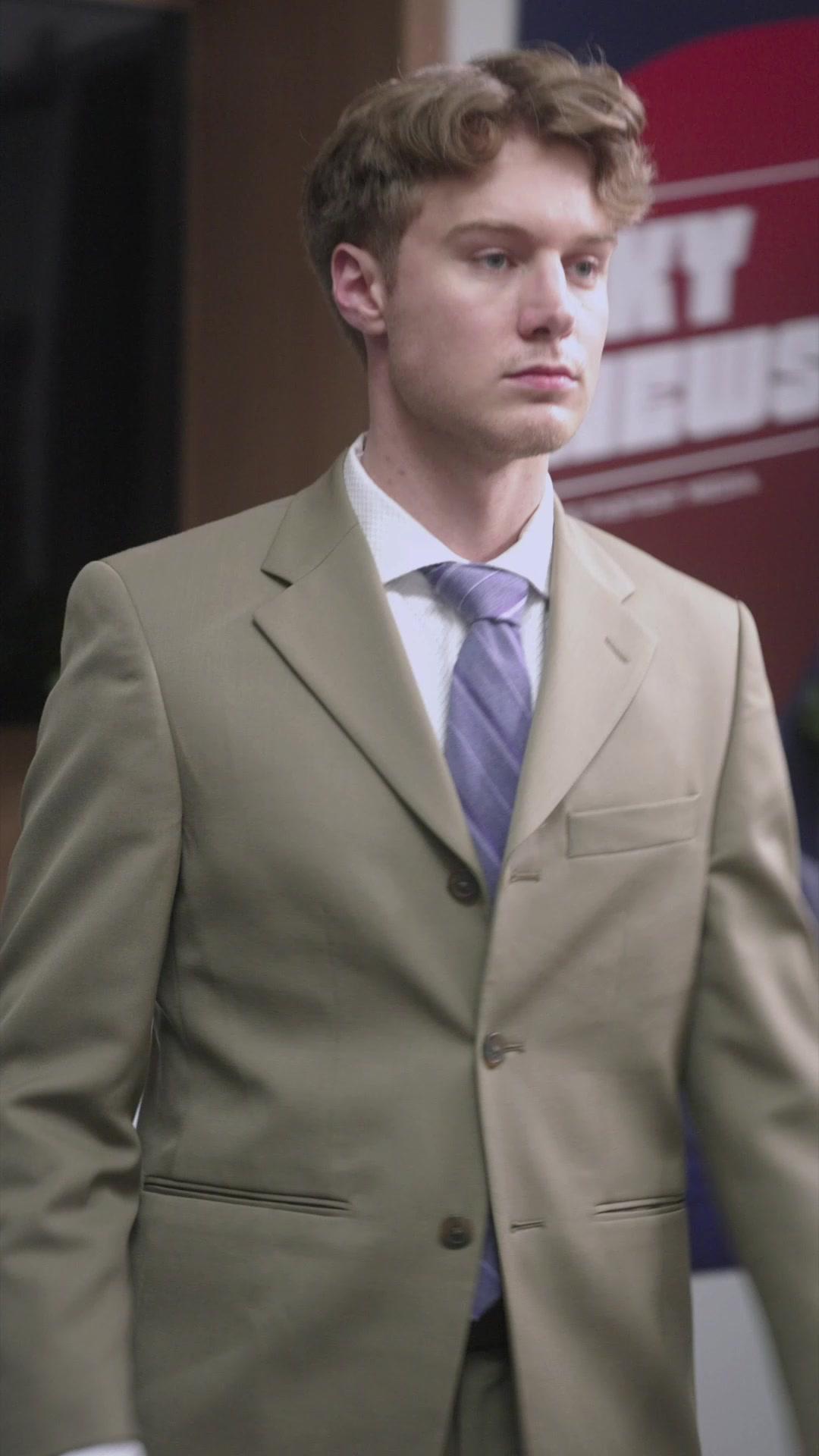 Let’s talk about Sebastian’s suit. Beige, not navy. Conservative, but not corporate. The lapels are narrow—modern, but not trendy. His tie is lavender with fine diagonal stripes, a choice that whispers ‘I have taste, but I won’t distract you from my words.’ He’s dressed to be taken seriously, not admired. And yet, when Kelly asks about his personal life, his hand rises—not nervously, but deliberately—to reveal the gold wedding band. It’s not hidden under his sleeve. It’s presented. Like evidence. In that instant, Sebastian transforms from interviewee to witness. He’s not being questioned; he’s testifying. And Kelly, holding her clipboard like a prosecutor’s brief, leans in just enough to signal she’s listening—not to his answer, but to the hesitation before it.