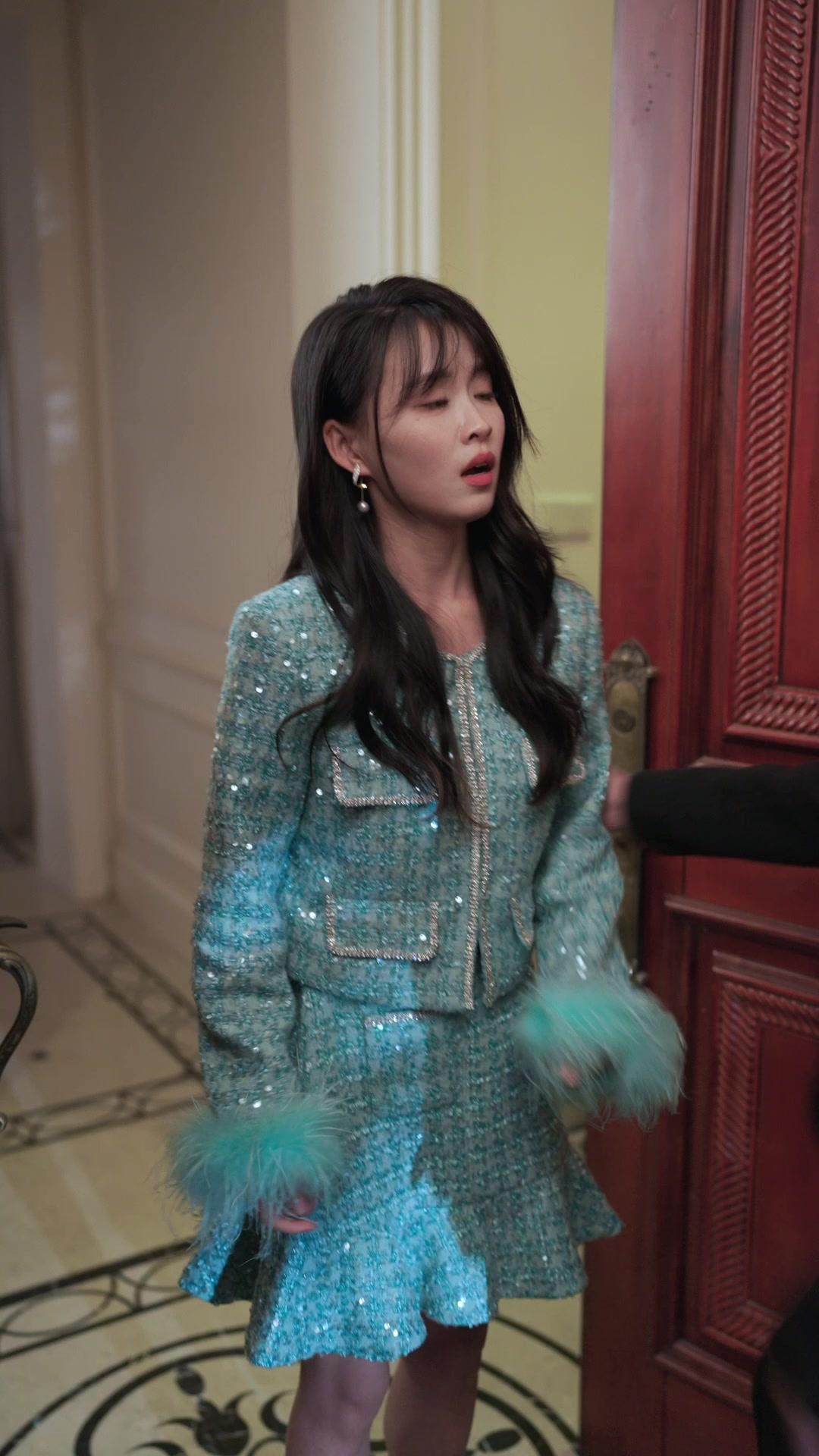 The opening shot of *Too Late for Love* is deceptively elegant—a woman in a shimmering turquoise tweed ensemble, feather-trimmed cuffs catching the light like seafoam on a luxury yacht deck. Her name is Lin Xiao, and she stands poised at the threshold of a grand mahogany door, lips parted mid-sentence, eyes wide with something between urgency and disbelief. It’s not just fashion; it’s armor. Every sequin, every rhinestone trim along the jacket’s lapel, speaks of curated perfection—yet her fingers tremble slightly as she grips the edge of her clutch. This isn’t a debutante arriving for cocktails. This is a woman walking into a reckoning.