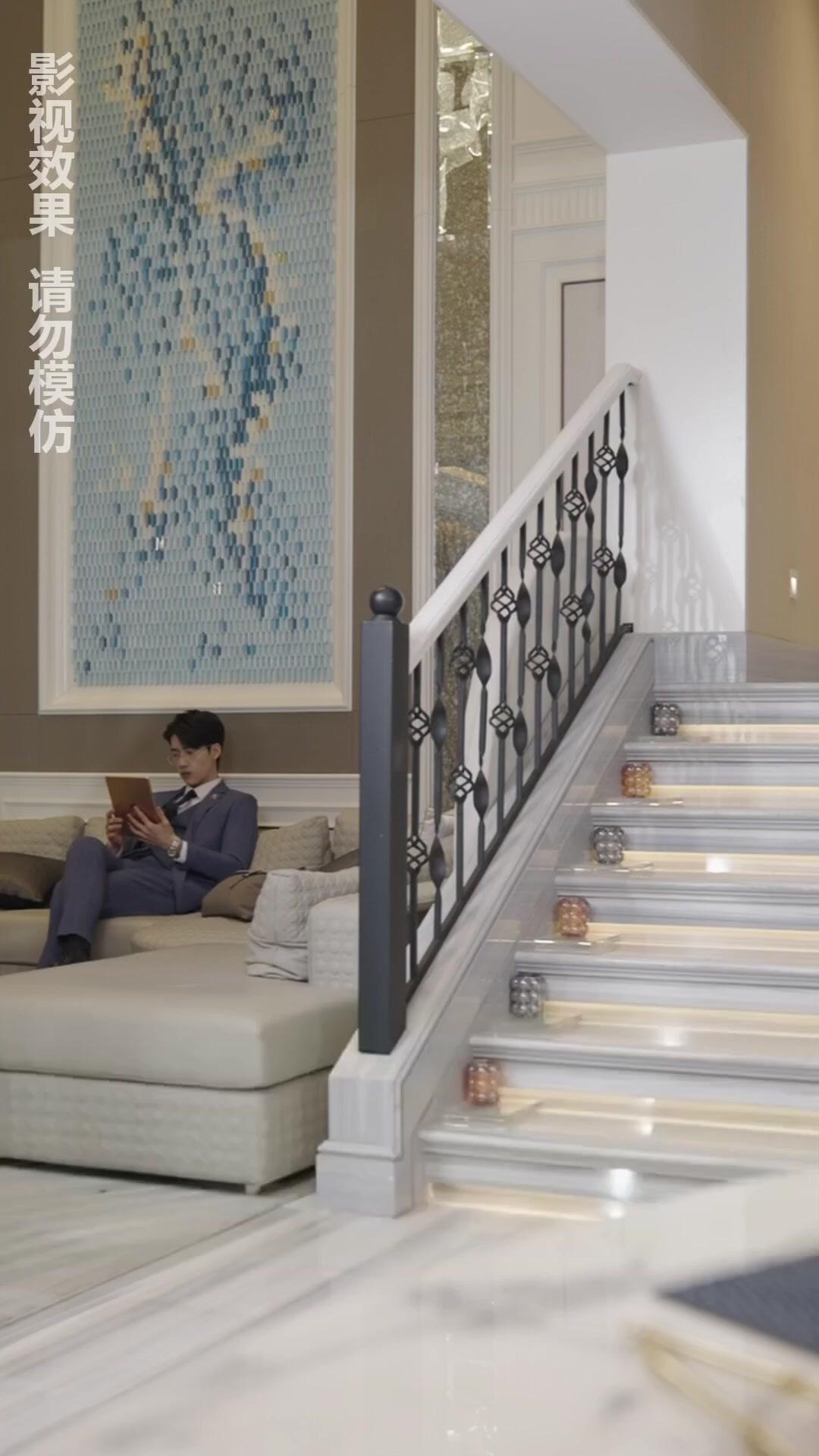 In a world where luxury interiors whisper more than dialogue ever could, the opening scene of this short drama—let’s call it *The Marble Staircase* for now—sets the tone with chilling precision. A man in a tailored navy three-piece suit, glasses perched just so, sits on a cream sectional sofa, tablet in hand, eyes scanning something unreadable to us. Behind him, a mosaic wall pulses with cool blues and golds, like a digital ocean trapped behind glass. To his right, a staircase rises—marble steps lit from beneath, wrought-iron balusters shaped like stylized lotus blossoms. It’s not just décor; it’s mise-en-scène as psychological architecture. Every element is calibrated to suggest control, order, wealth—but also isolation. He doesn’t look up when she enters. Not immediately. That hesitation, that micro-pause before acknowledgment, tells us everything: he expected her, but not yet. Or perhaps he hoped she wouldn’t come at all.