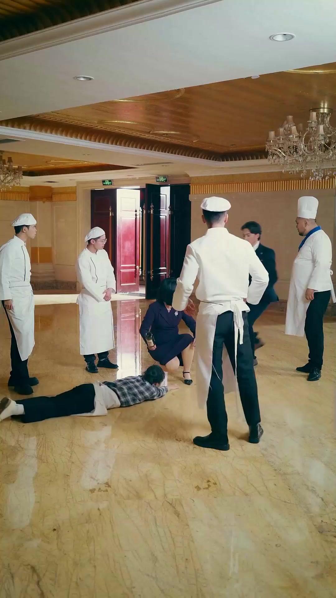 Meanwhile, the chefs stand frozen. Not out of indifference, but paralysis. Their white coats are pristine, their hats stiff and ceremonial, yet their expressions betray a collective cognitive dissonance: *This isn’t part of the service protocol.* One chef—Chen Da, the heavyset one with the blue neckerchief—shifts his weight, fingers twitching at his side. He looks at the woman on the floor, then at Lin Zhi, then at Manager Su, who strides forward holding a wine bottle like a weapon she hasn’t decided whether to wield or surrender. Su’s outfit is immaculate: navy blazer, pearl necklace, floral brooch pinned like a badge of authority. But her eyes? They flicker. Not with concern, but calculation. When she speaks—her voice sharp, clipped, laced with theatrical outrage—she doesn’t address Lin Zhi directly. She addresses the *air* around him. ‘Is this how you treat staff?’ she demands, though no one has accused him of anything yet. It’s a classic power move: preemptive deflection. She’s not defending the fallen woman; she’s defending the *image* of the establishment. The wine bottle in her hand isn’t an offering—it’s a prop in her performance of moral high ground.