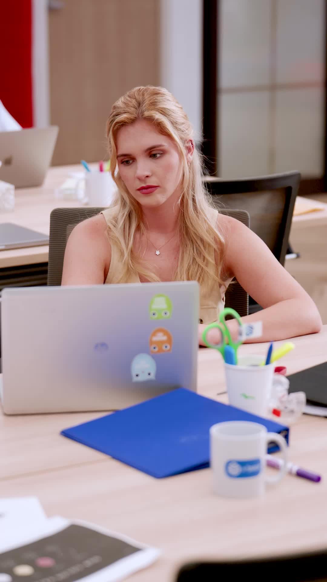 Watch how the lighting changes when she enters—suddenly it’s not an office, it’s a courtroom. That man in black? His micro-expressions scream ‘I signed the wrong NDA’. The way she places both hands on the table? Iconic power move. And the blonde’s eye-roll-to-sigh arc? Relatable AF. Twins Love Trap for Billionaire Dad nails corporate toxicity with flair—and those stickers on the laptop? A tragicomic detail. 😅💻