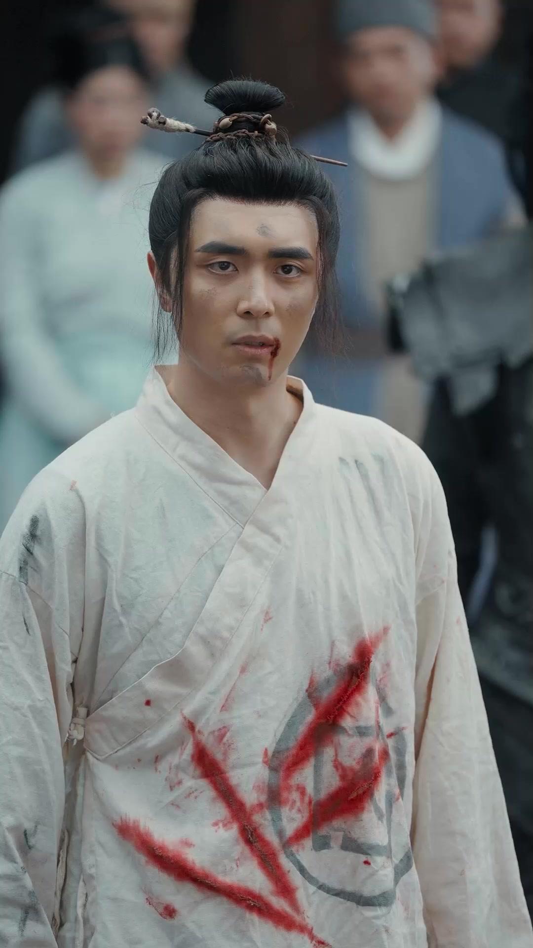 In the courtyard of a weathered magistrate’s hall, where wooden beams groan under centuries of judgment and red lacquer peels like dried blood, a young man stands—bound, broken, yet unbroken. His white robe, once pristine, is now a canvas of crimson defiance: bold strokes of red paint slash across his chest, over a charcoal-gray seal that reads ‘罪’—guilt. A single streak of blood traces his lower lip, not from injury, but from the weight of words he cannot take back. His hair, tied high with a frayed cord and a rusted pin, sways slightly as he turns his head—not in fear, but in quiet disbelief. He looks at the magistrate, then at the kneeling elder, then back at the crowd behind him, their faces a mosaic of pity, suspicion, and silent fury. This is not just a trial. It is a reckoning.