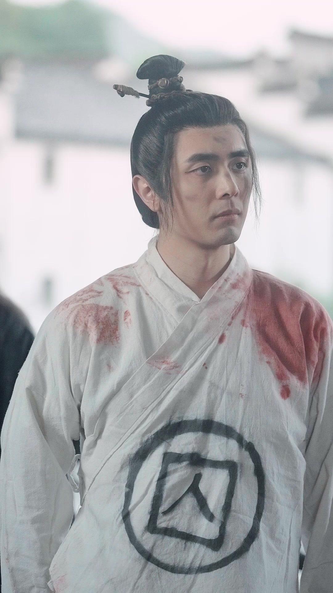 In the hushed corridors of an ancient temple, where incense smoke curls like forgotten prayers and carved wooden panels whisper secrets of dynasties past, a single white robe—stained crimson at the shoulder and chest—becomes the silent protagonist of a moral reckoning. This is not mere costume design; it is narrative cloth, soaked in ambiguity. The man wearing it, Li Zhen, stands with his head slightly bowed, eyes flickering between defiance and exhaustion, as if every breath costs him something irreplaceable. His hair, bound high with a simple black hairpin that holds a feathered arrowhead—a curious detail, almost ceremonial—suggests he was once a scholar or perhaps a low-ranking official, now stripped bare by fate. The large black circle emblazoned on his chest, enclosing the character ‘人’ (ren), meaning ‘human’ or ‘person’, is no ordinary insignia. It reads like a verdict: *You are marked—not as criminal, but as human*. In a world obsessed with hierarchy, purity, and elemental balance, to be labeled simply ‘human’ is both a humiliation and a quiet rebellion. Whispers of Five Elements does not shout its themes; it lets them bleed into fabric, into posture, into the way Li Zhen’s fingers twitch when someone speaks his name too loudly.
